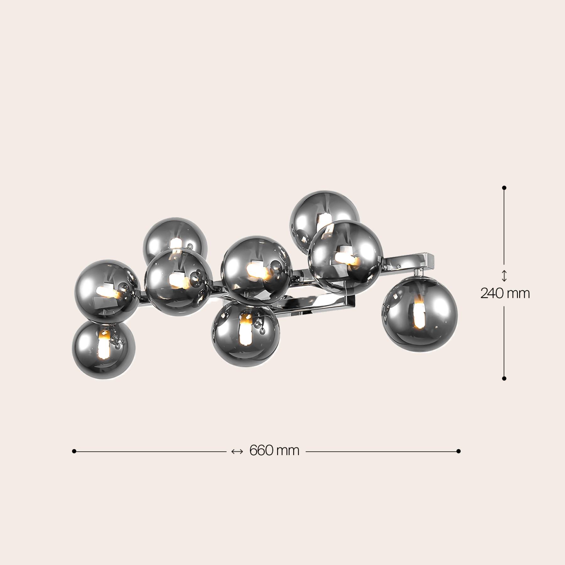 Металлическая арматура в четырех цветах: матовый черный, хром, золото, латунь. Плафоны — выдувное стекло. Цвета — дымчатый, янтарный, коньячный. Дизайн с имитацией молекулярной структуры. Высота подвесных светильников регулируется тросом. Лампа с цоколем G9.