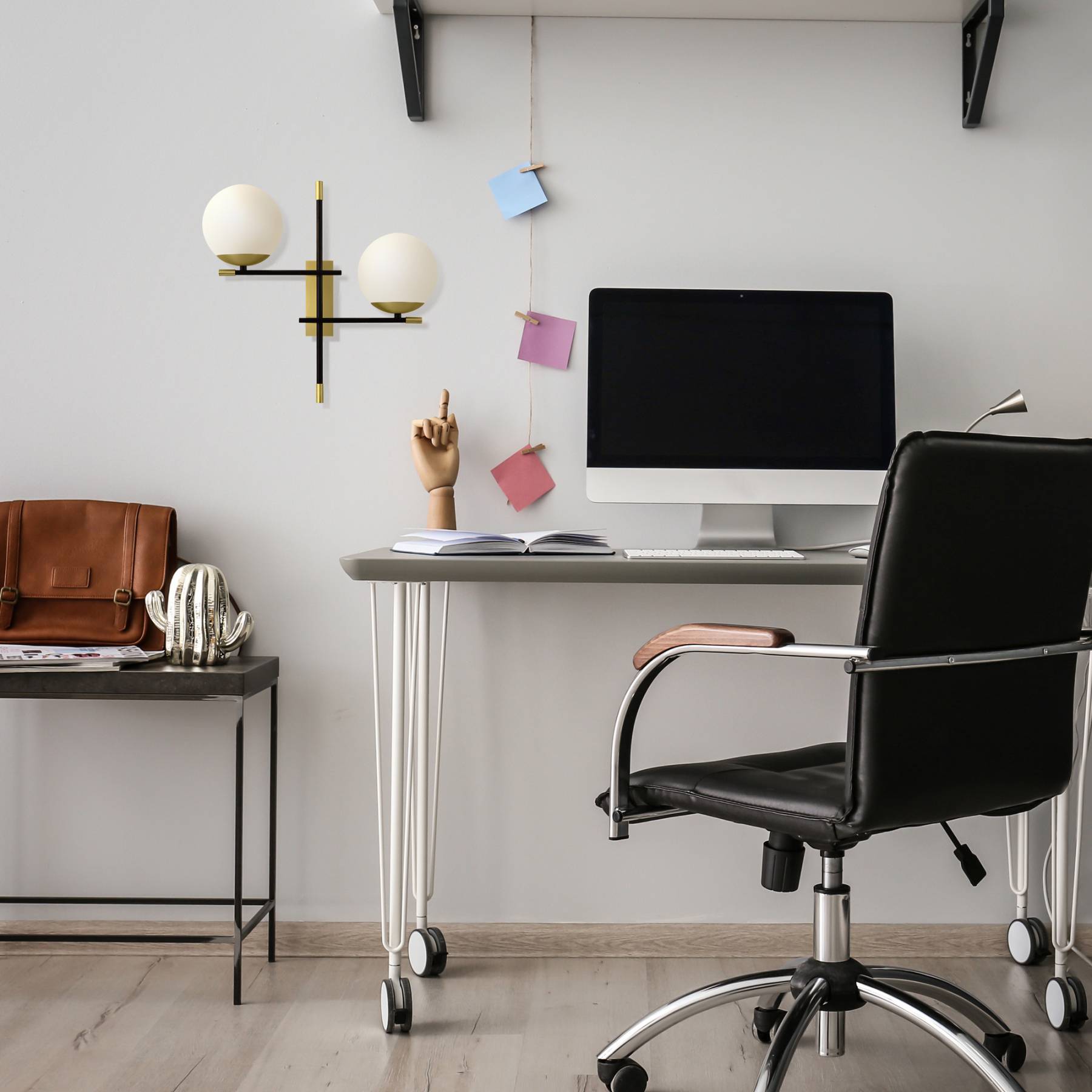 Арматура из металла в цвете матового золота. Плафоны-сферы из матового выдувного стекла. Модная асимметрия в дизайне. Источник света — лампы с цоколем Е14.