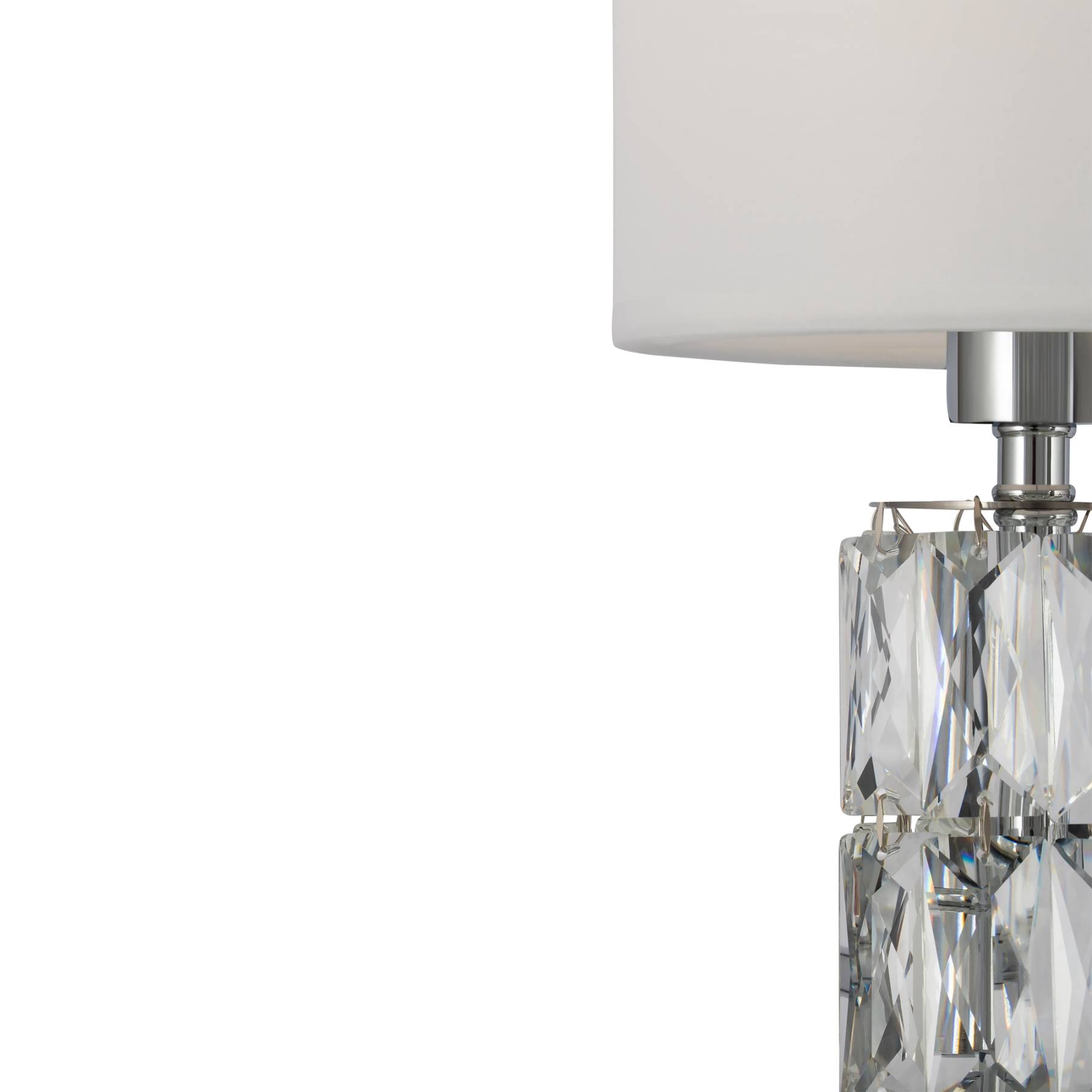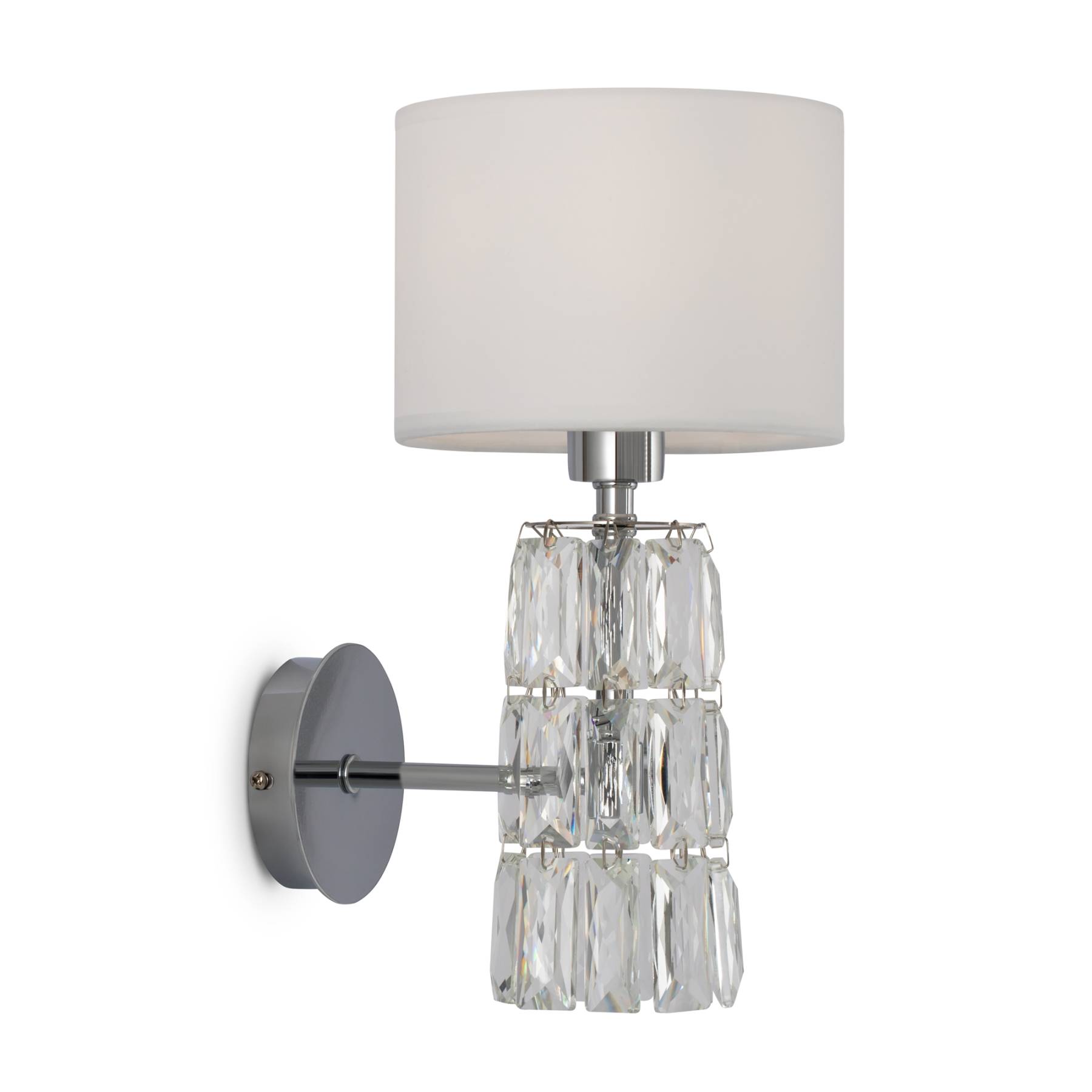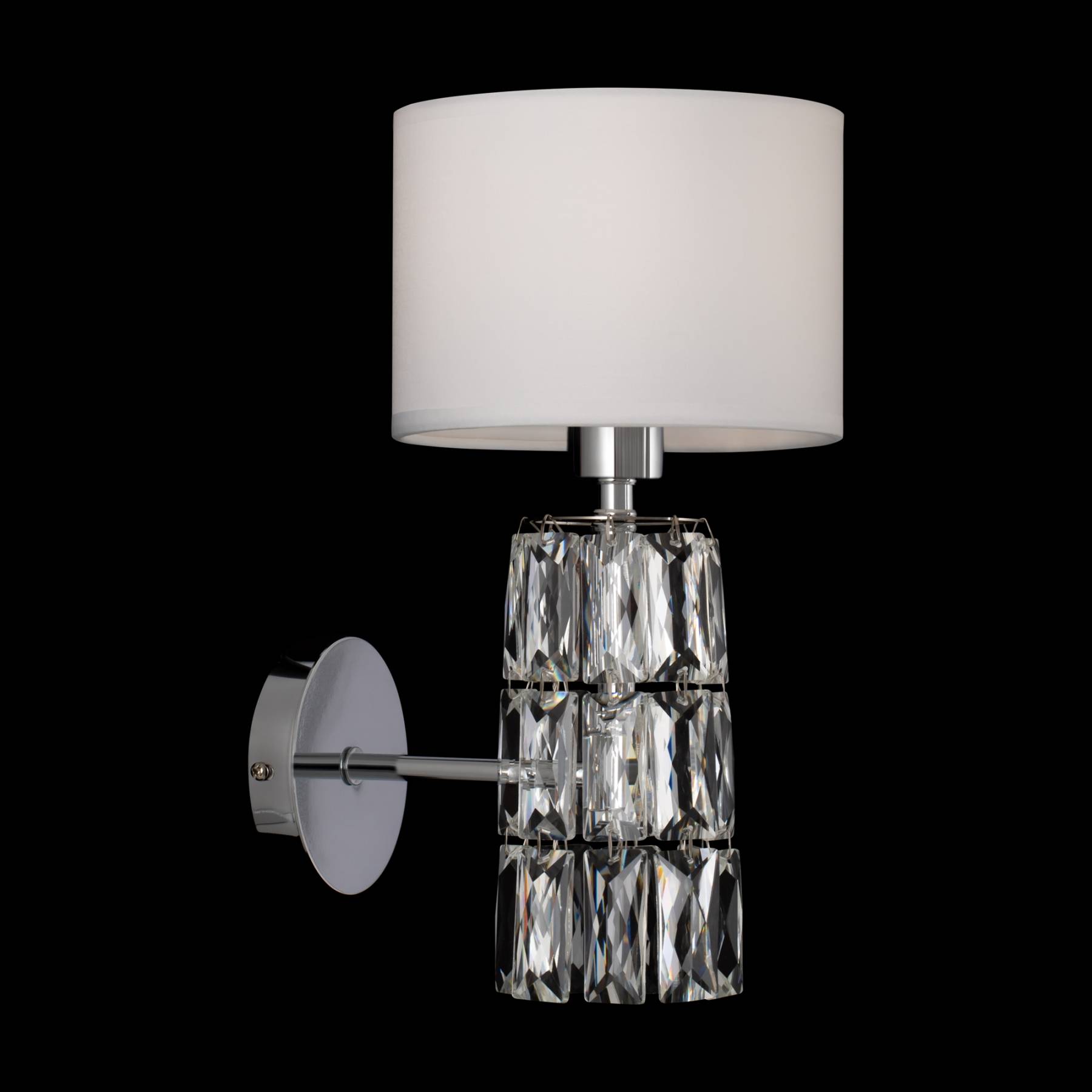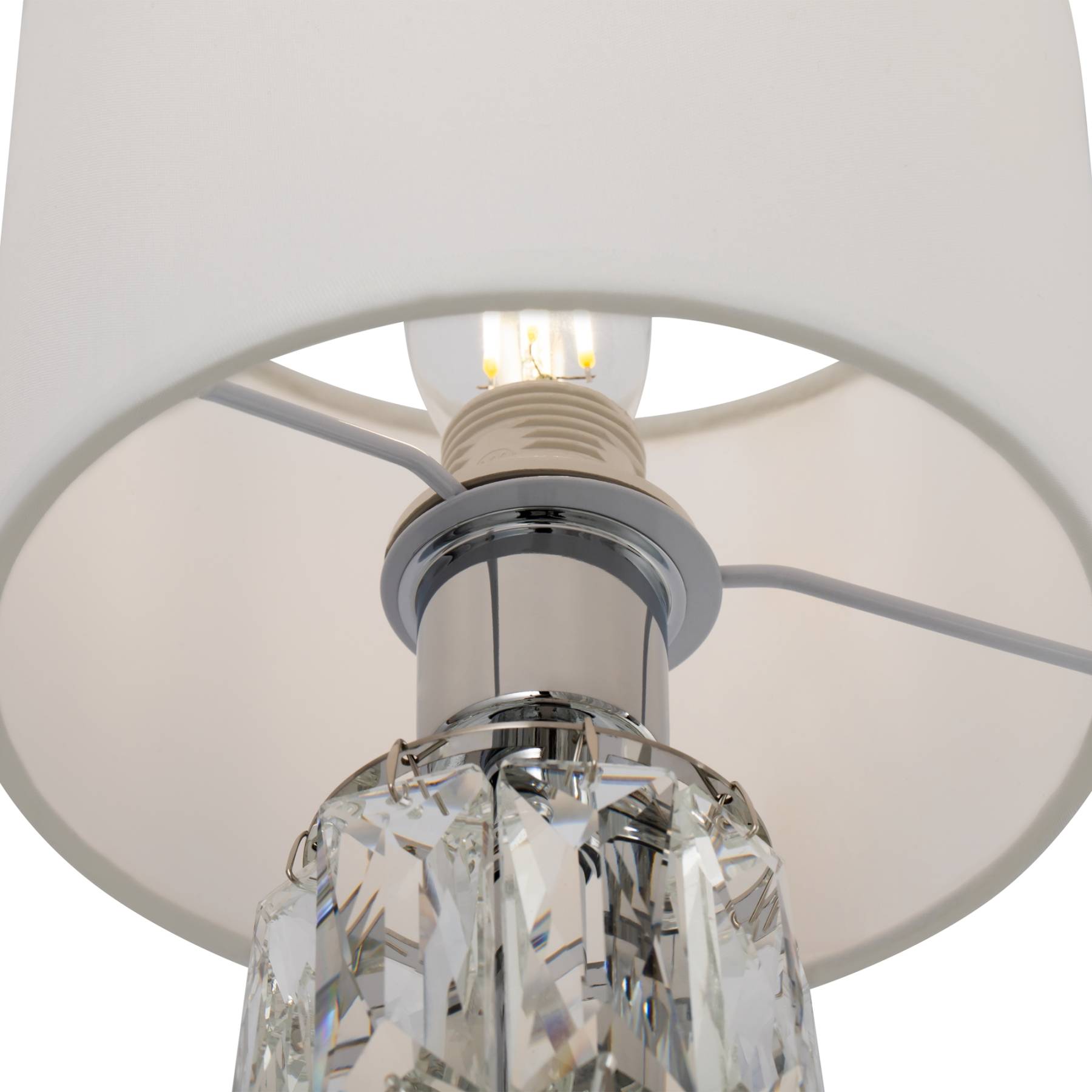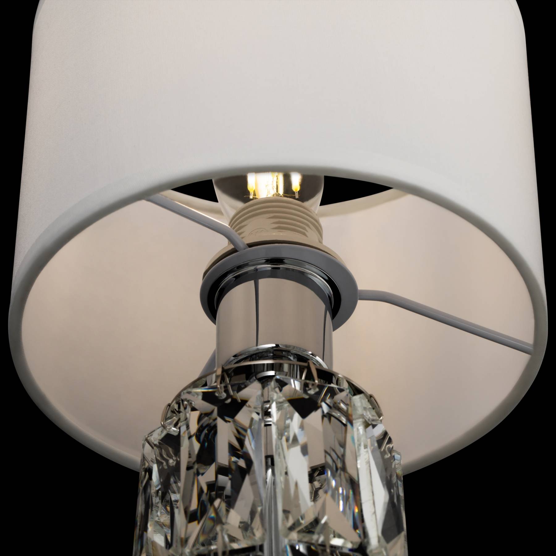 Арматура из металла, цвет – хром. Абажуры из текстиля, нанесенного на ПВХ. Цвет – белый. Декор – массивные кристаллы сложной огранки. Высота подвесных моделей регулируется.