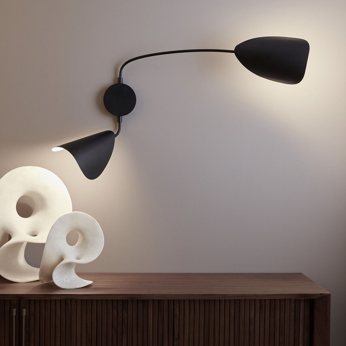Тонкая и воздушная форма, вдохновленная движущимися объектами и природой, поворачивающийся абажур в форме листа. Два поворачивающихся асимметричных кронштейна, которые создают направленное освещение и графический эффект.