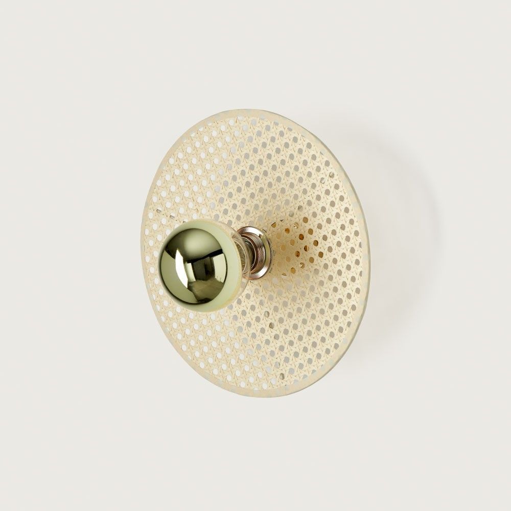 Настенное бра, выполненное из мателла и ротанга в современном стиле. Состоит из металлического фиттинга размером 10 см золотого цвета и рассеивающего диска из ротанга 30 см в натуральном цвете.