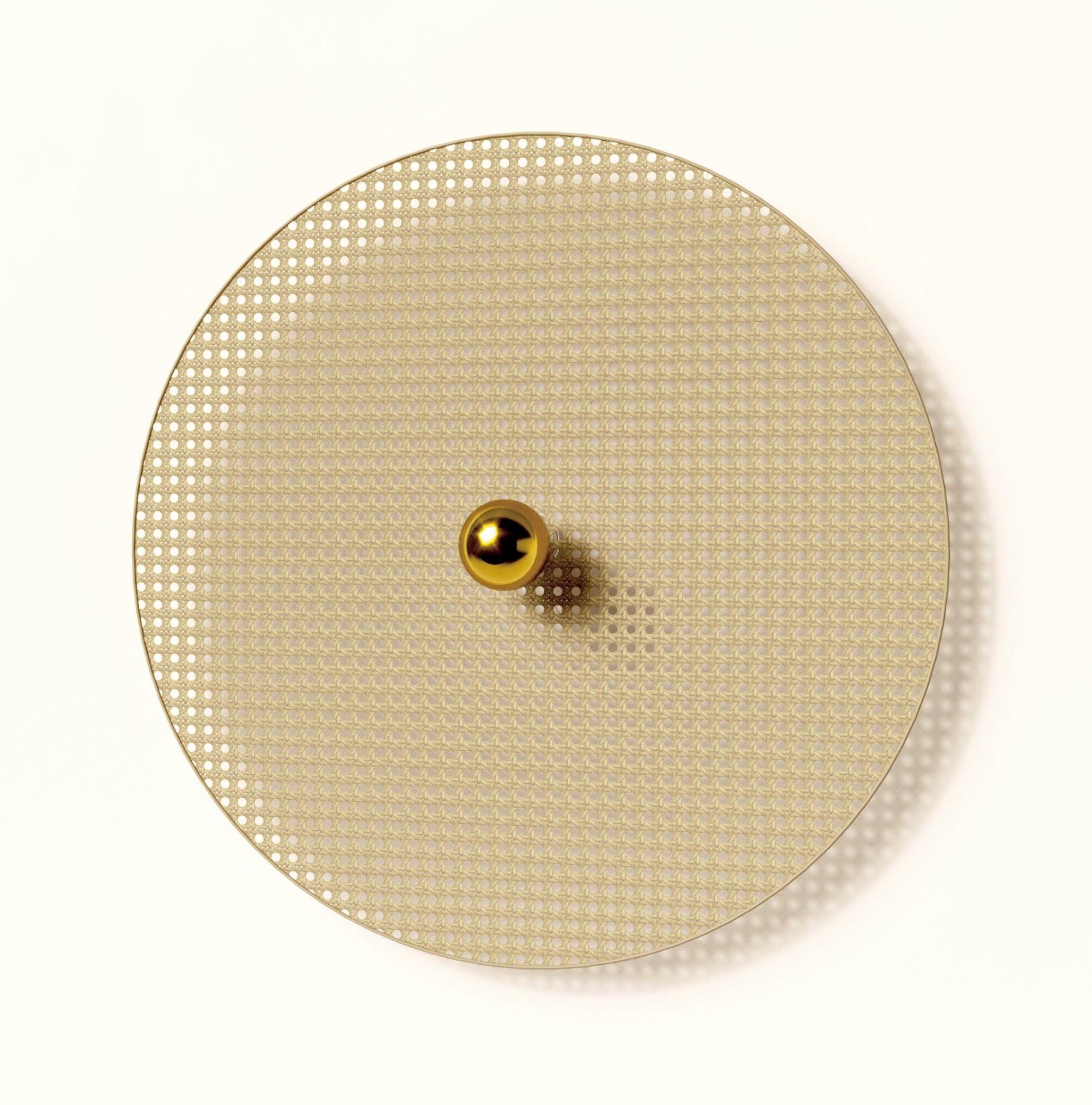 Настенное бра, выполненное из мателла и ротанга в современном стиле. Состоит из металлического фиттинга размером 5 см золотого цвета и рассеивающего диска из ротанга 60 см в натуральном цвете.