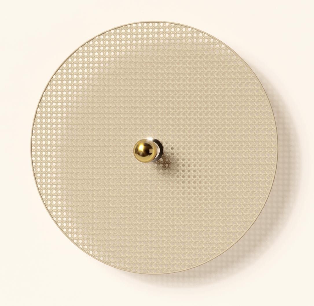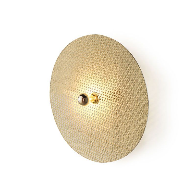 Настенное бра, выполненное из металла и ротанга в современном стиле. Состоит из металлического фиттинга размером 15 см золотого цвета и рассеивающего диска из ротанга 90 см в натуральном цвете.