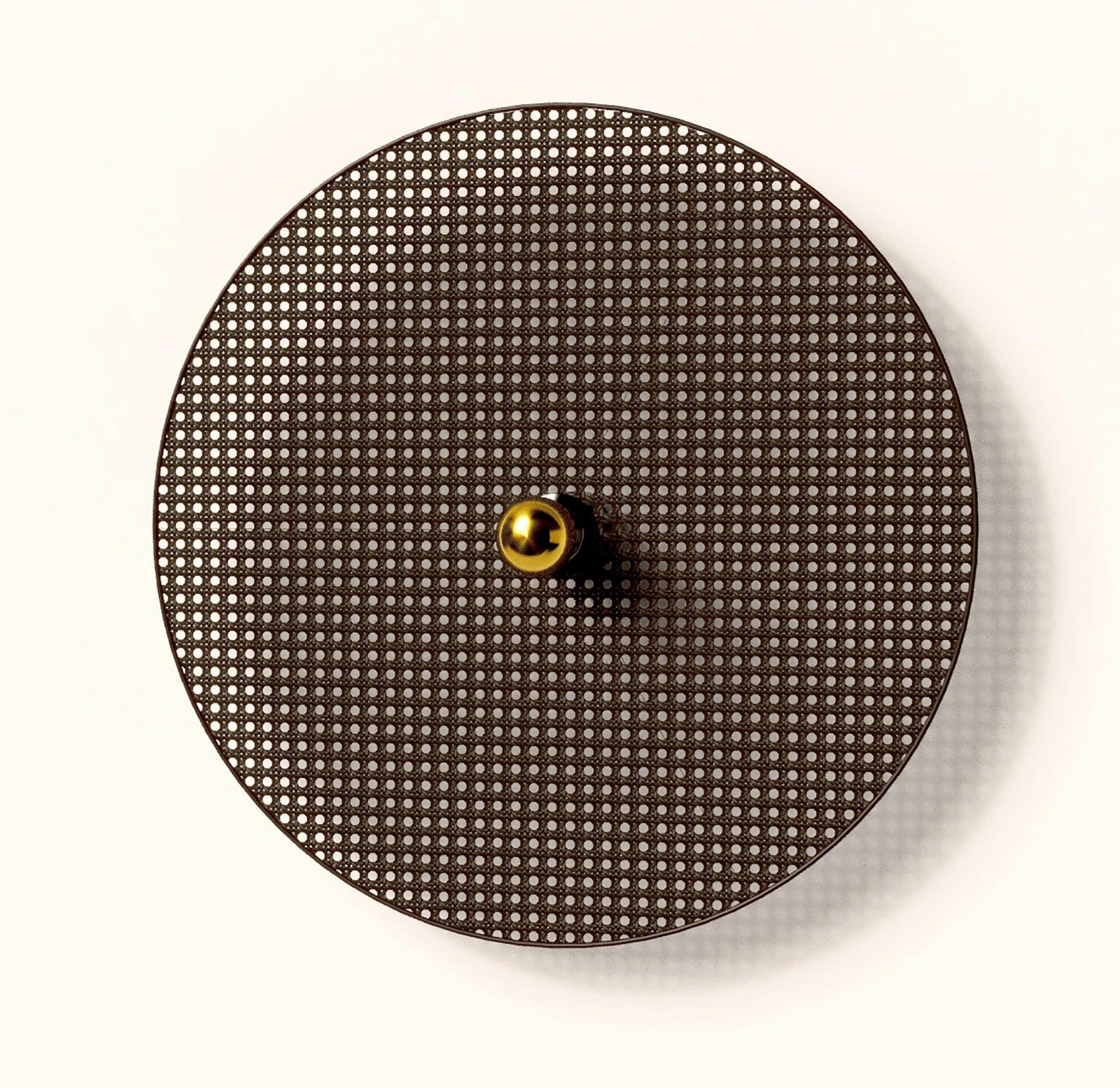 Настенное бра, выполненное из металла и ротанга в современном стиле. Состоит из металлического фиттинга размером 5 см золотого цвета и рассеивающего диска из ротанга 90 см в натуральном цвете.