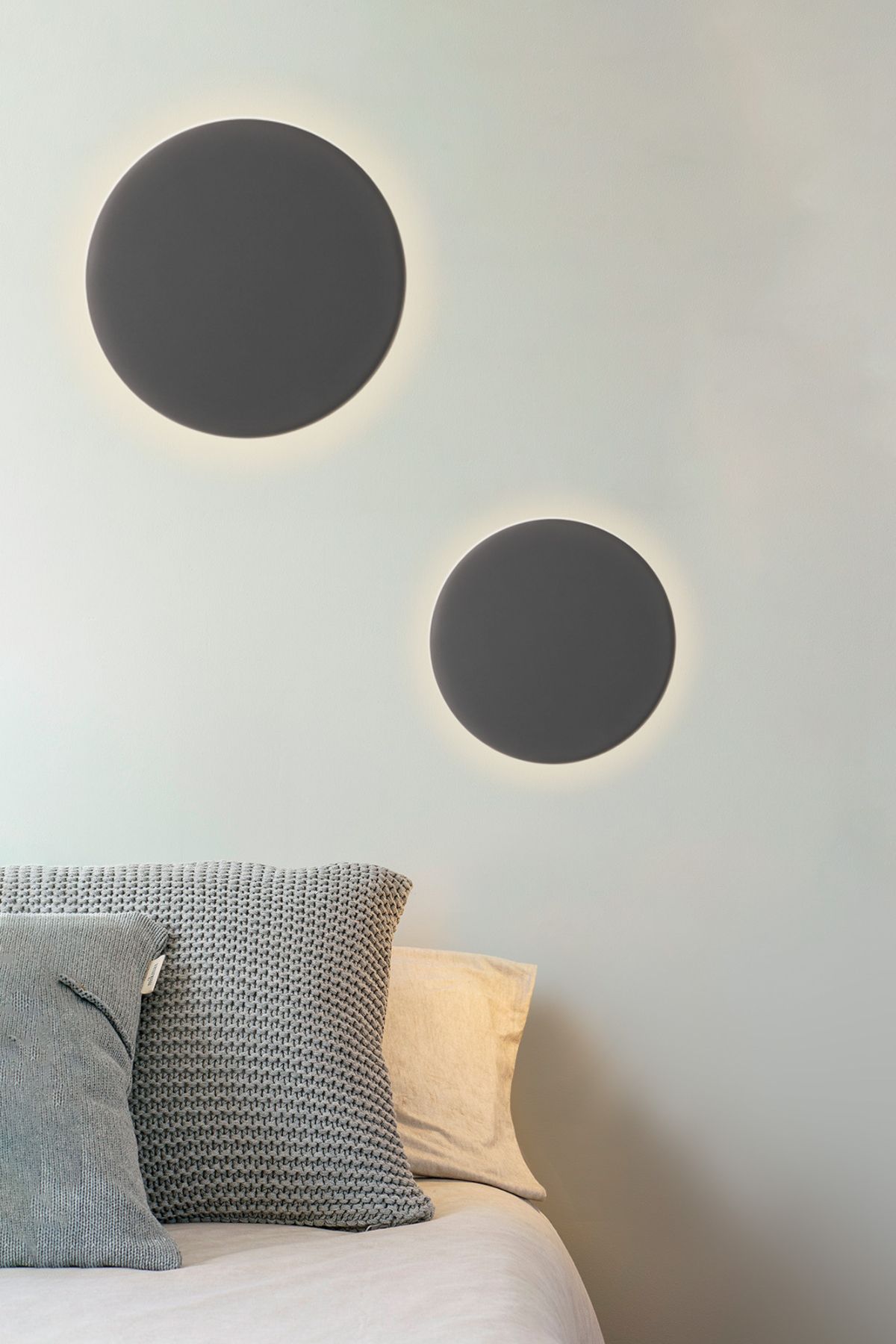 TOU - это дизайнерский настенный светильник, созданный Faro Lab. Он изготовлен из алюминия и имеет покрытие из ткани и поролона. Свет косвенно излучается круглым лучом его конструкции. Это позволяет создавать разные комбинации и красивую ванну из света. Его можно найти в двух размерах и цветах. Это серая версия диаметром 35 см.
