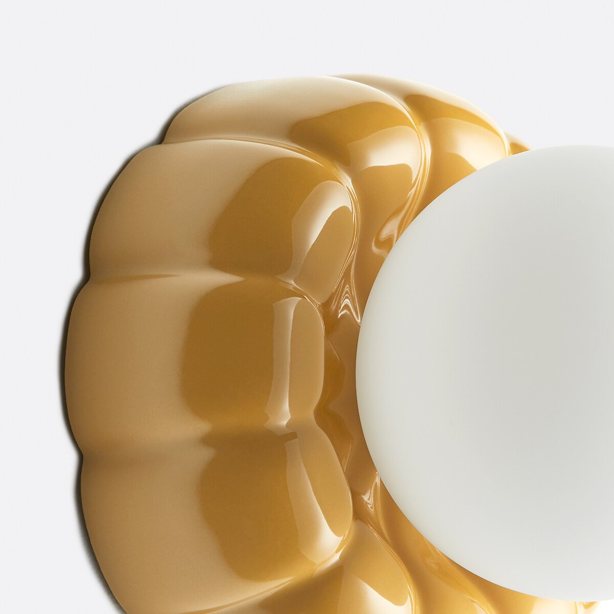 Мягкость матового опалового стекла в сочетании с оригинальным дизайном керамического основания — настенный светильник Holi привносит в современные интерьеры дух поп-музыки 70-х годов. Творение La Redoute Intérieurs.