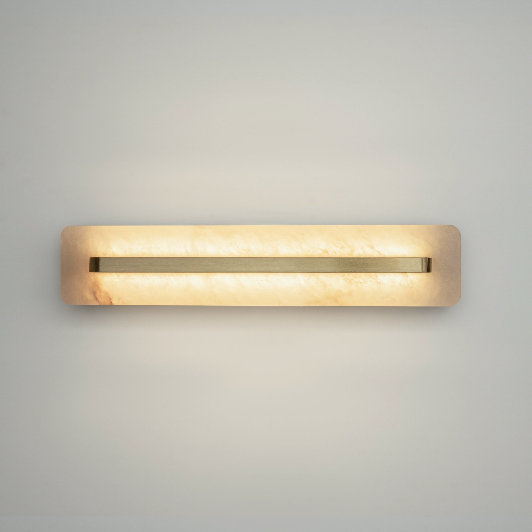 Настенные светильники с рассеивателем из алебастра. Цвет арматуры — латунь. Материал арматуры — металл. LED-источник света. Цветовая температура 3000К. Три размера: 400, 600, 800 мм. Возможность создания композиций и установки горизонтально или вертикально. Мягкий переотраженный свет. Основание из металла цвета сатинированной латуни. Модульный дизайн для создания световых инсталляций.