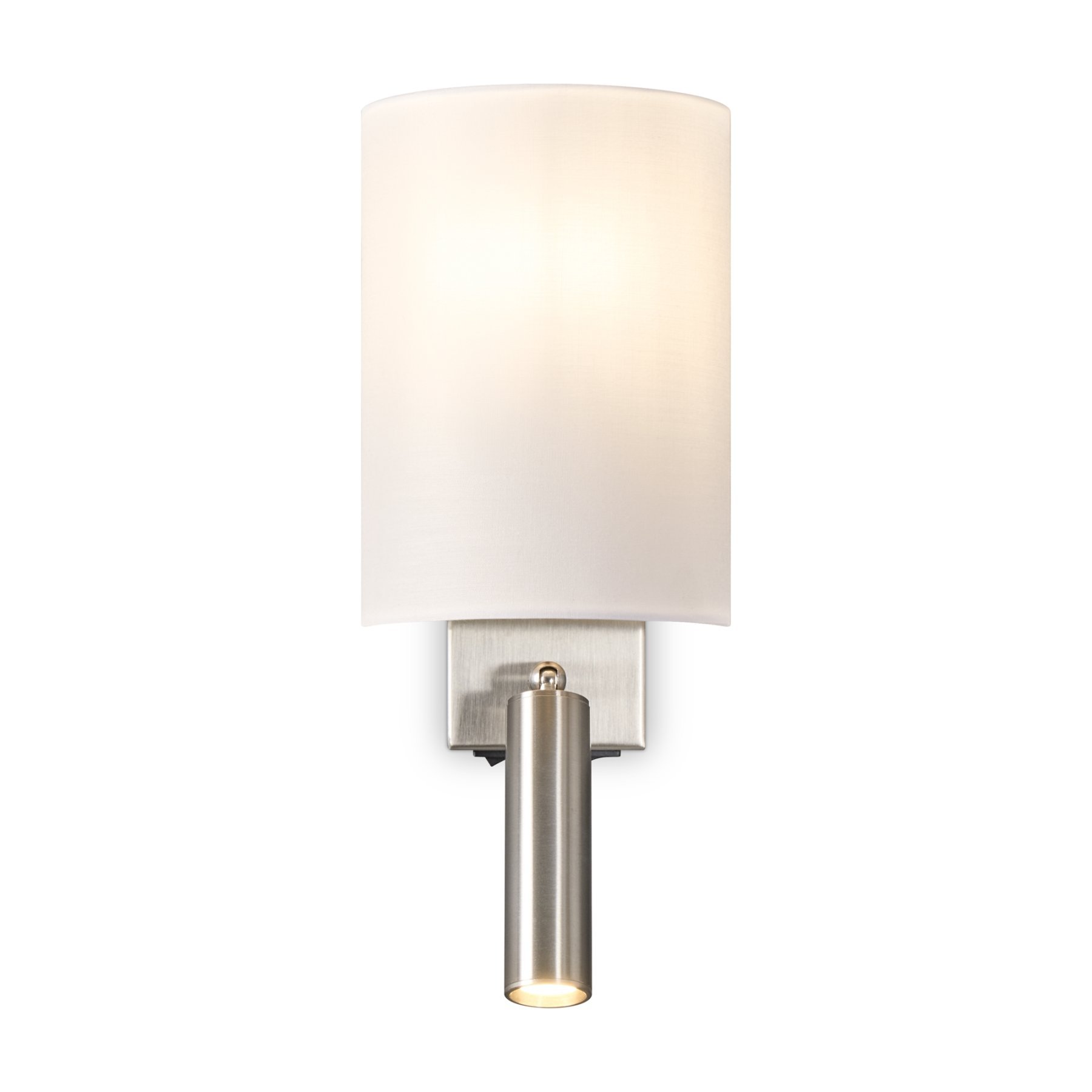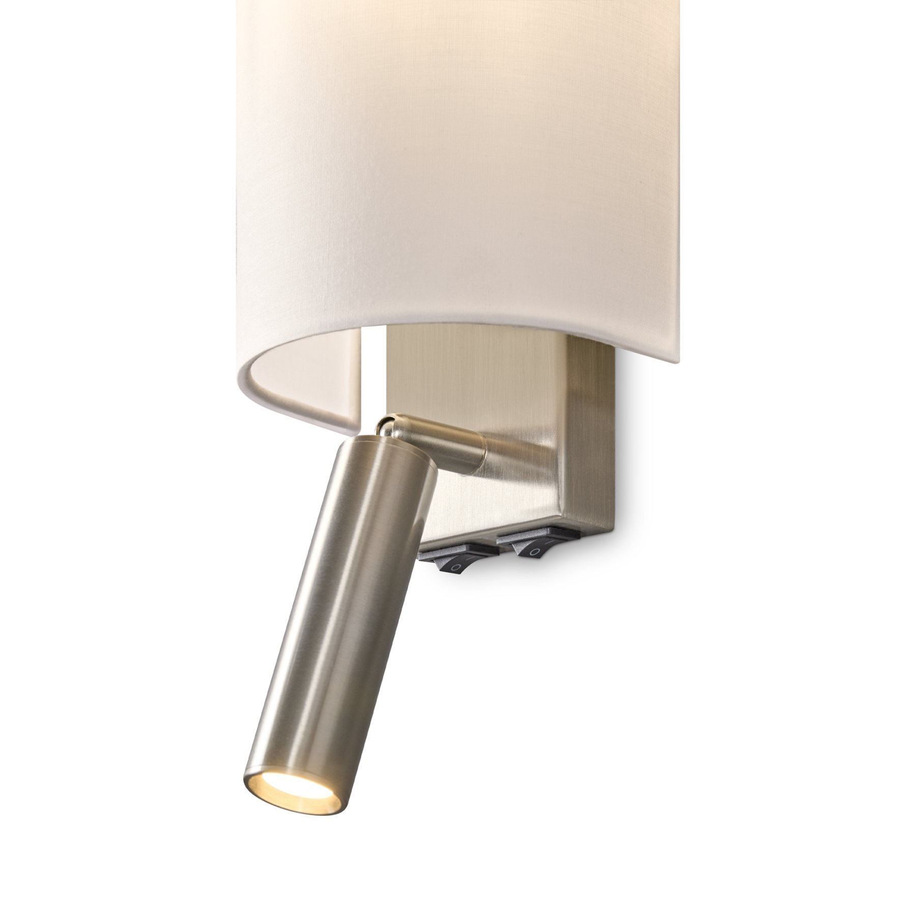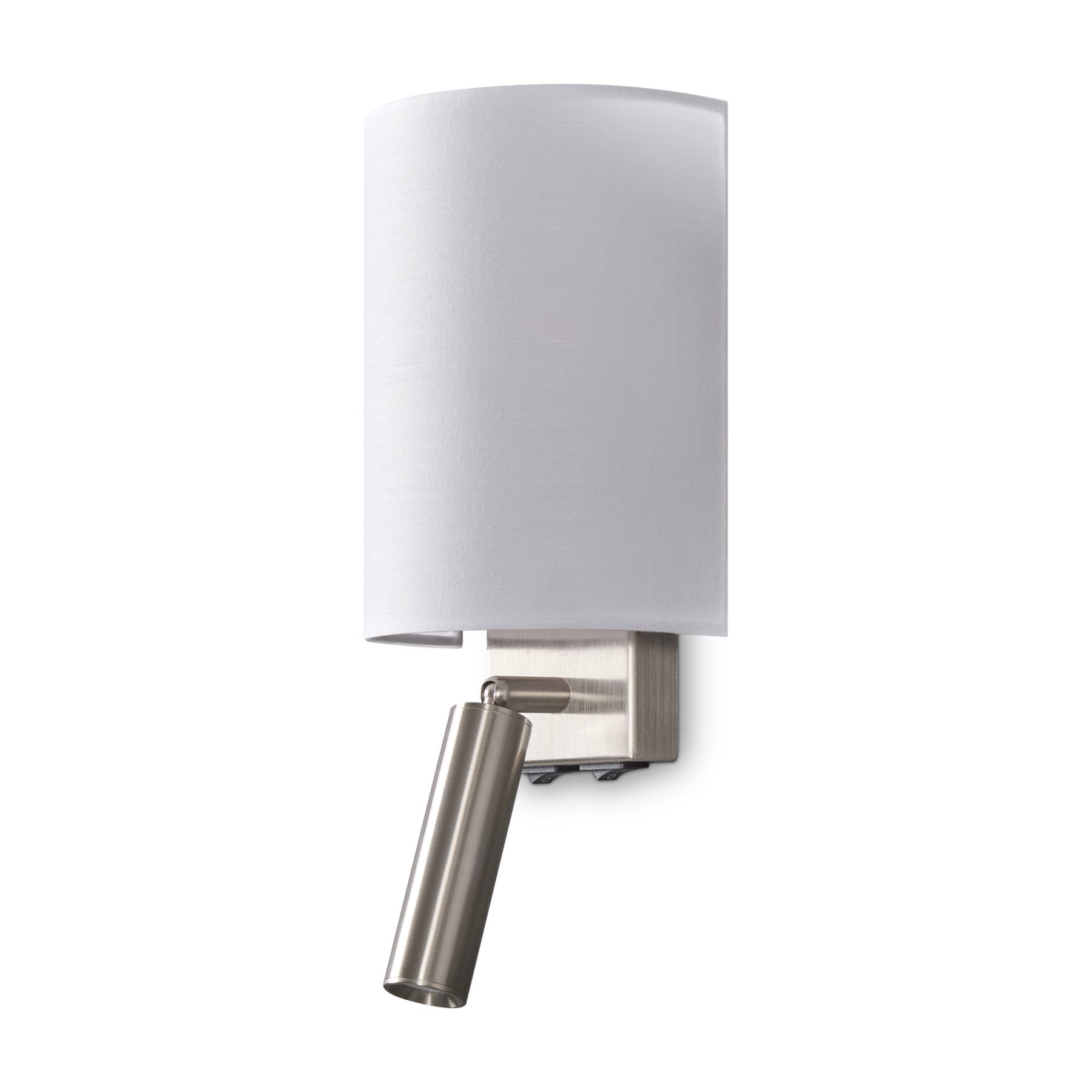 Цилиндрической формы абажур из ткани белого цвета. Декоративная парящая окантовка из металла в цвет арматуры. Регулируется по длине. Компактные размеры подходят для низких потолков и небольших интерьеров. Металлическая арматура, цвет - латунь и никель.  Источник света — лампа с цоколем Е14, E27 и для настенного бра дополнительный LED с температурой свечения 3000 K.
