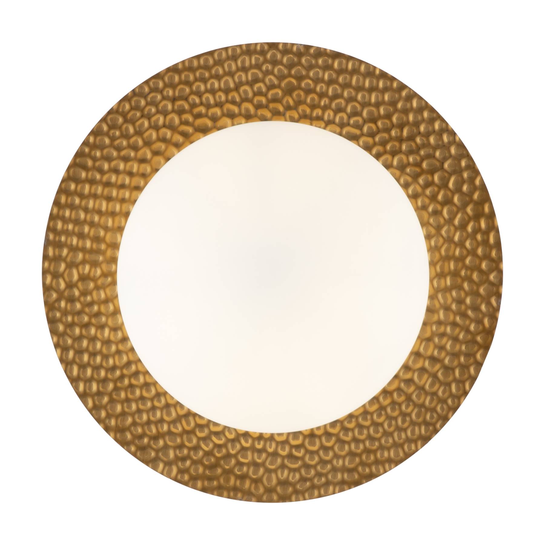 Арматура из металла, цвет – латунь. Плафоны сферической формы из матового белого стекла. Плоские розетки с эффектом чеканки. Трендовый микс фактур. Источник света – лампа с цоколем Е27.