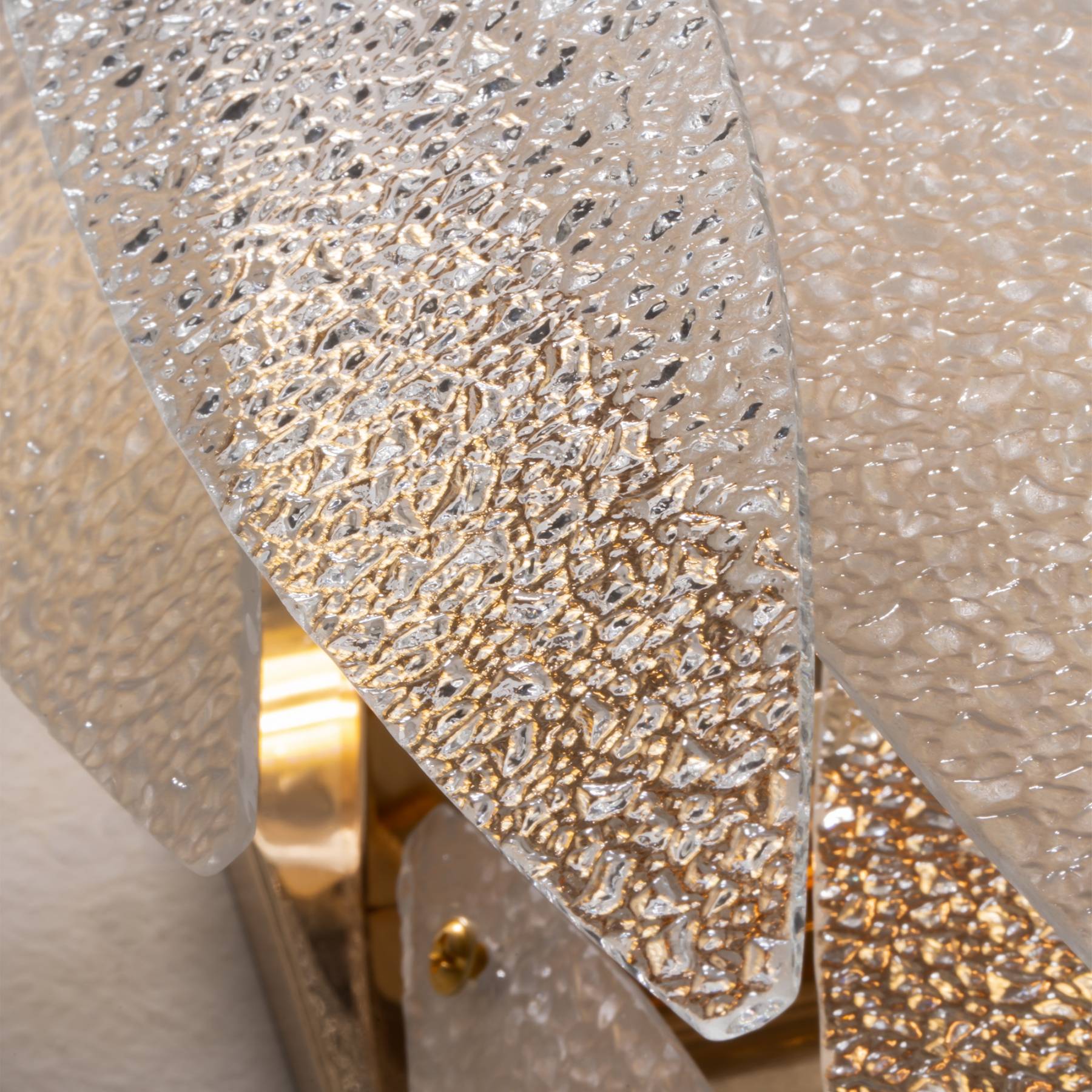 Металлическая арматура, цвет - французское золото. Декоративные элементы из прозрачного стекла в форме пестрых лепестков "замороженной" фактуры. Источник света - лампы с цоколем Е14 скрыты за декоративными подвесками на металлической окружности. Высота подвесов регулируется.