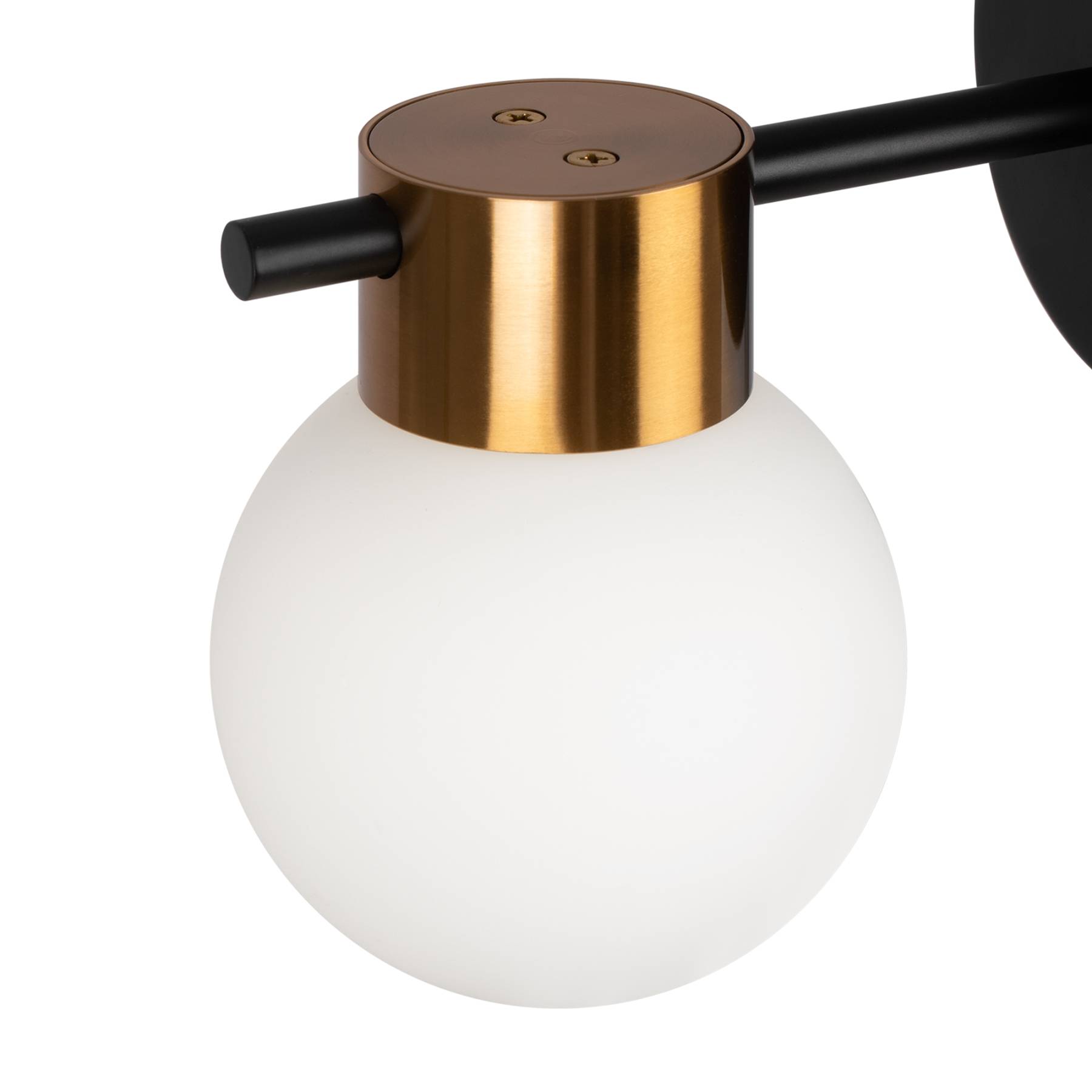 Металлическая арматура, цвет - черный + латунь. Стеклянные плафоны в двух оттенках - матовый белый или дымчатый. Направление плафонов в разные стороны позволяет распределить свет максимально равномерно. Источник светал - лампы с цоколем G9.