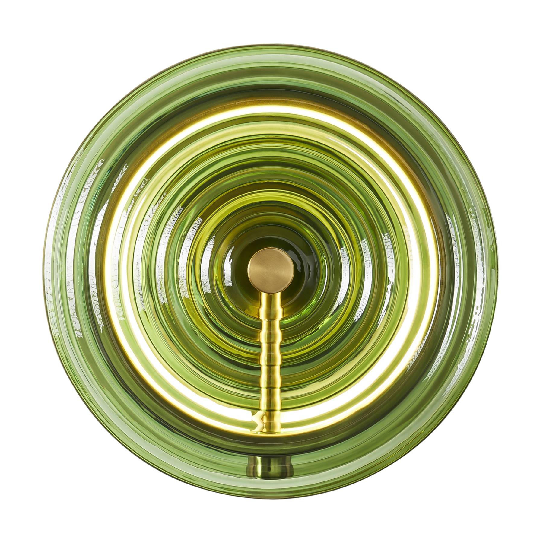 Арматура - металл. Цвет арматуры латунь. Плафоны из стекла в форме леденцов выполнены в четырех цветах: серый, зеленый, прозрачный и желто-оранжевый. Широкий спектр типов светильников: торшеры, настенные бра и подвесы. LED источник света. Цветовая температура 3000К.