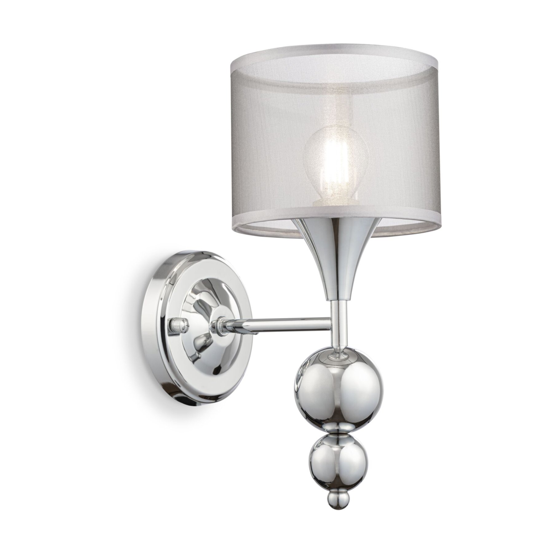Материал арматуры – металл. Цвет – хром. Абажуры из полупрозрачной органзы серебристого оттенка. Декор – хромированные шары. Высота люстр регулируется. Одиночный подвес с цоколем Е27, лампа, бра, торшер и люстры – Е14.