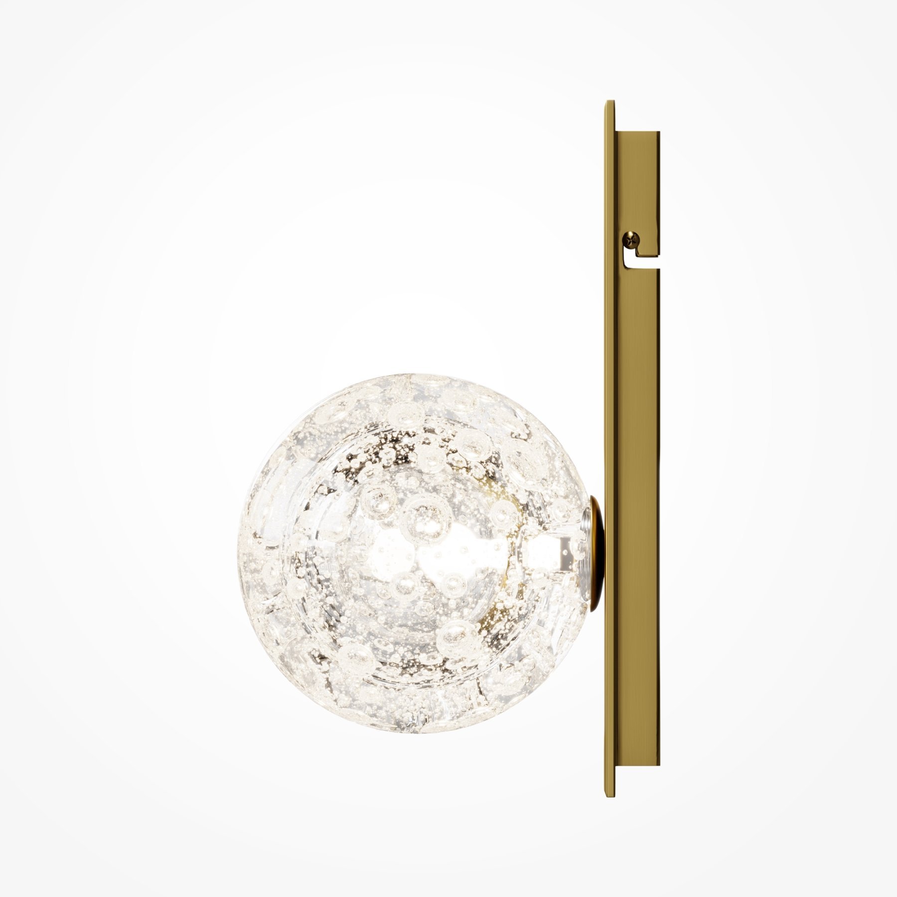 Плафон выполнен из стекла ручной работы с уникальными выдувными пузырьками. Арматура выполнена из алюминия в цвете сатинированной латуни. Сменный источник света с цоколем G9. Каждый светильник уникален благодаря индивидуальной технике ручного выдувания стекла. Обеспечивает мягкое рассеянное освещение, идеально подчеркивающее текстуру стекла. Предназначен для создания изысканных акцентов в интерьерах классического стиля и ар-деко. Рекомендуется для гостиных, спален, коридоров и ресторанов.