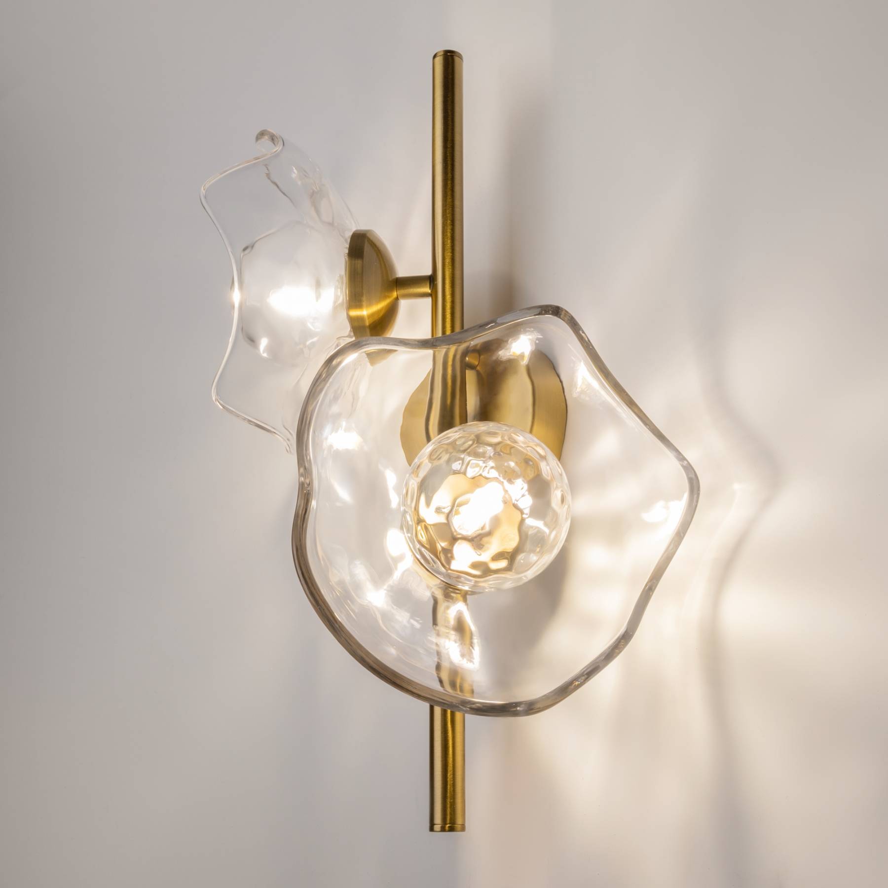 Арматура - металл, цвет - латунь. Плафоны-соцветия из литого стекла в плавных формах. Эффектные световые блики на плавных рельефах плафона. Источник света - лампа с цоколем G9.