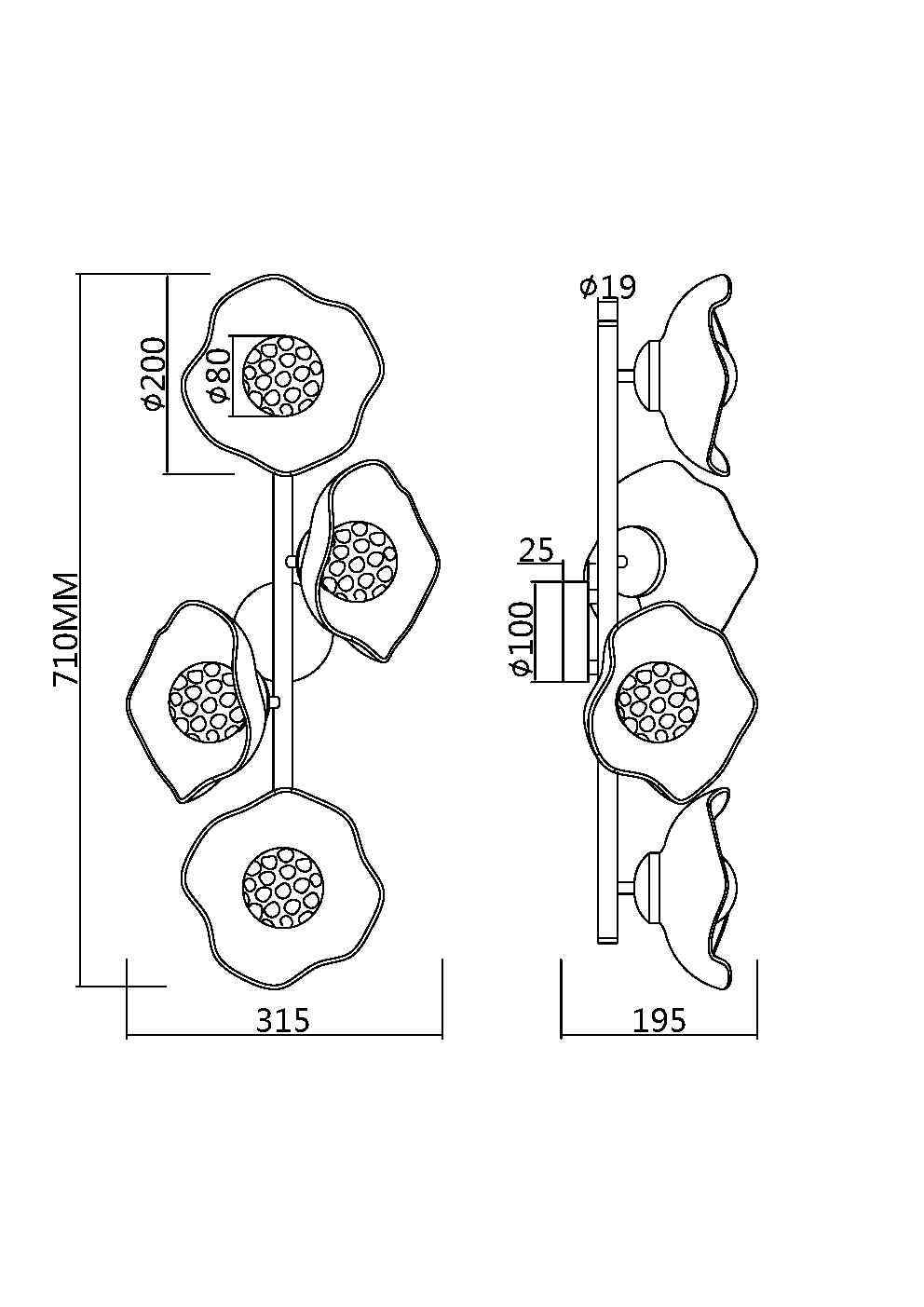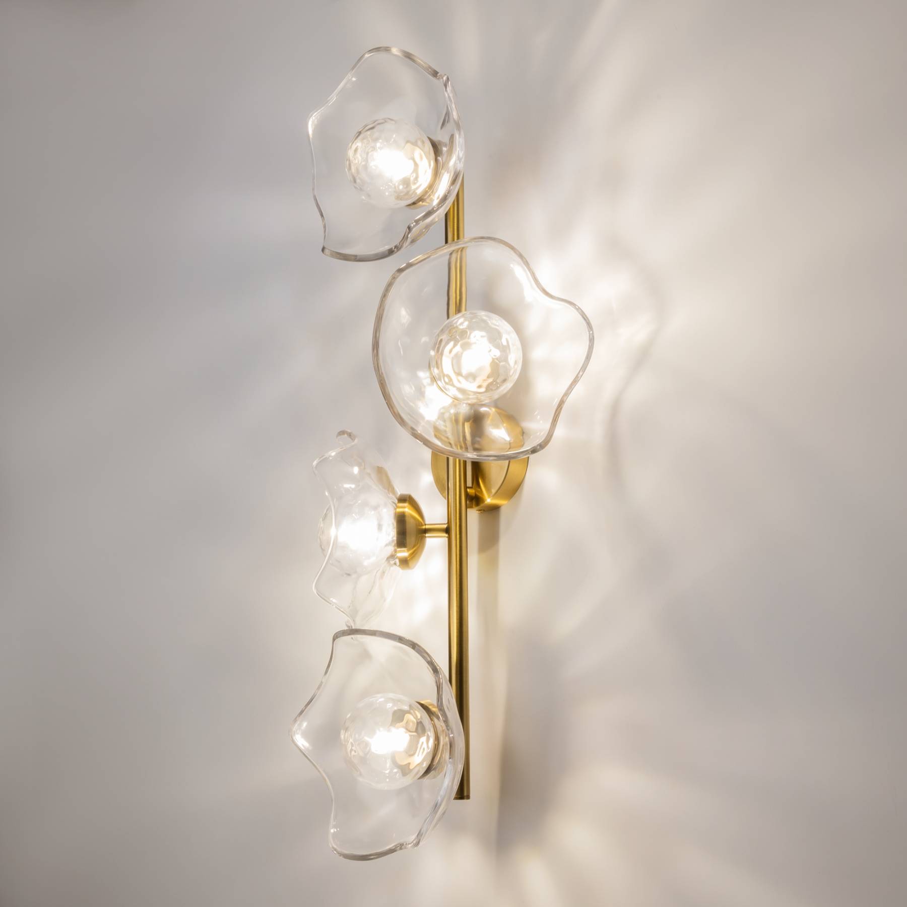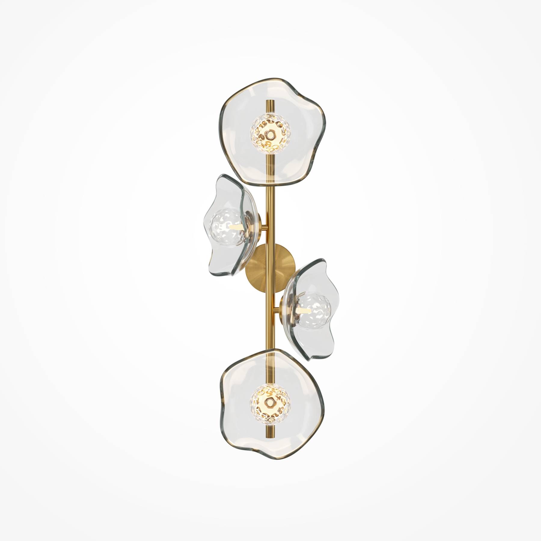 Арматура - металл, цвет - латунь. Плафоны-соцветия из литого стекла в плавных формах. Эффектные световые блики на плавных рельефах плафона. Источник света - лампа с цоколем G9.