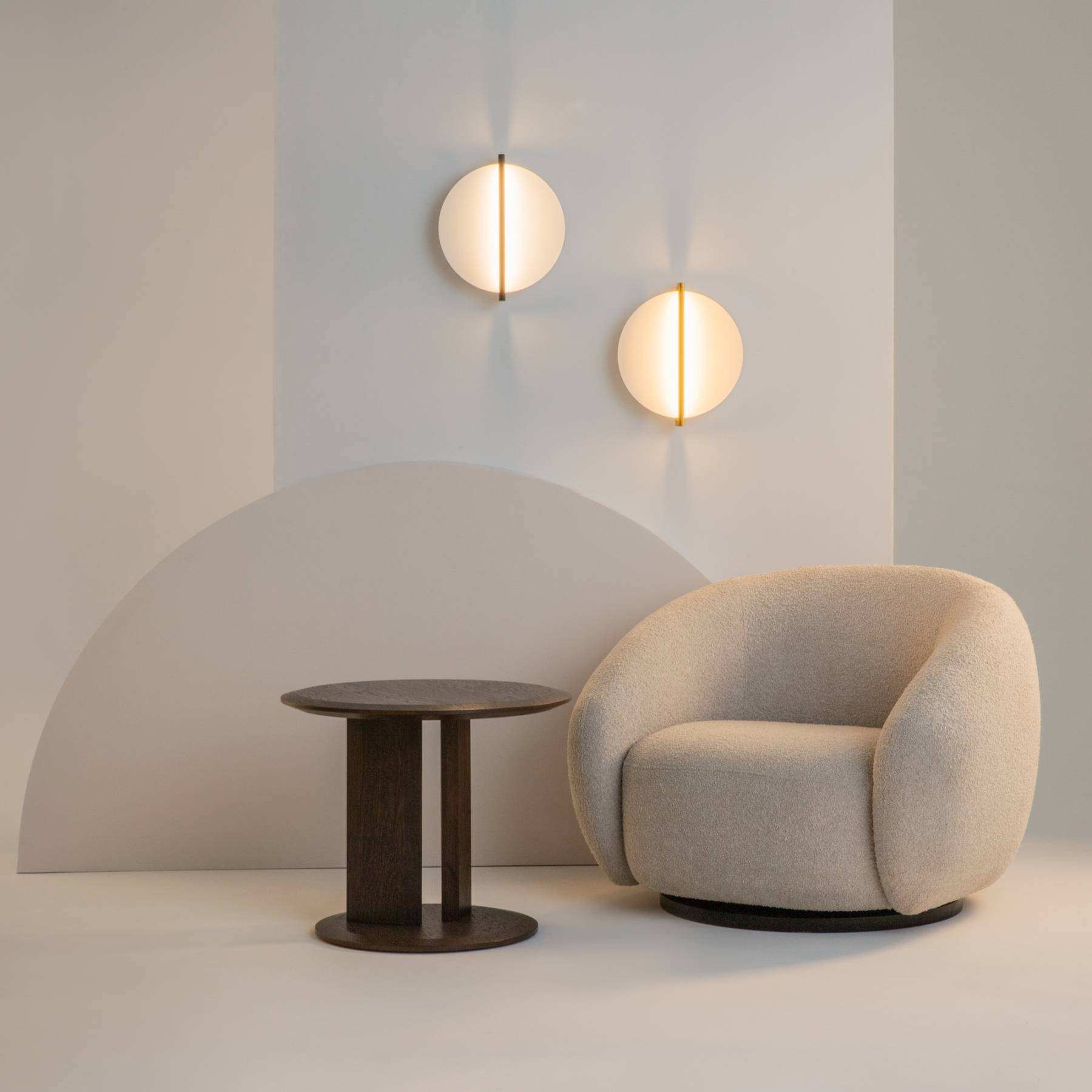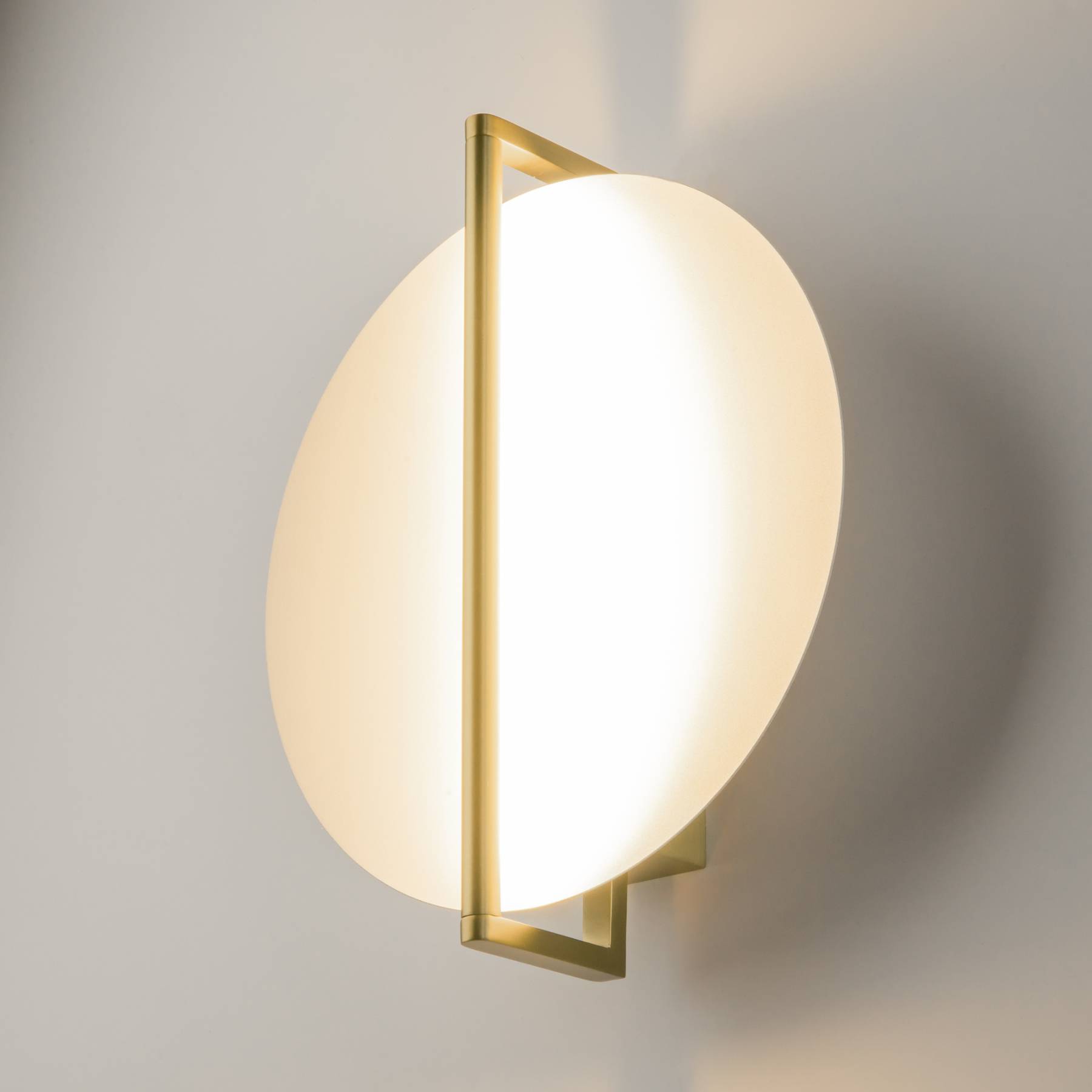 Металлический световой элемент в двух цветах (латунь, черный) со скрытым рассеивателем. Белый матовый диск-отражатель мягко рассеивает свет. Магнитное крепление плафона к арматуре. LED-источник света, цветовая температура 3000К.