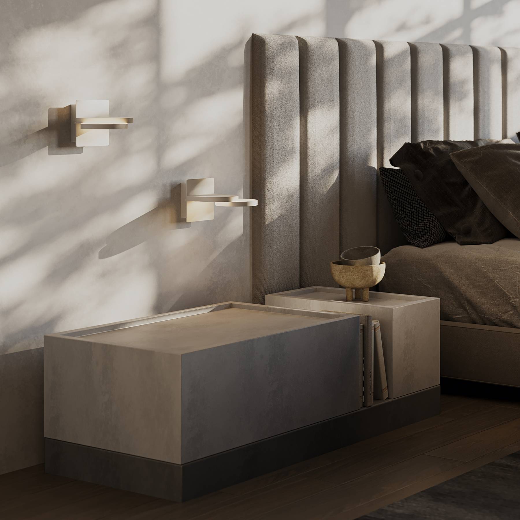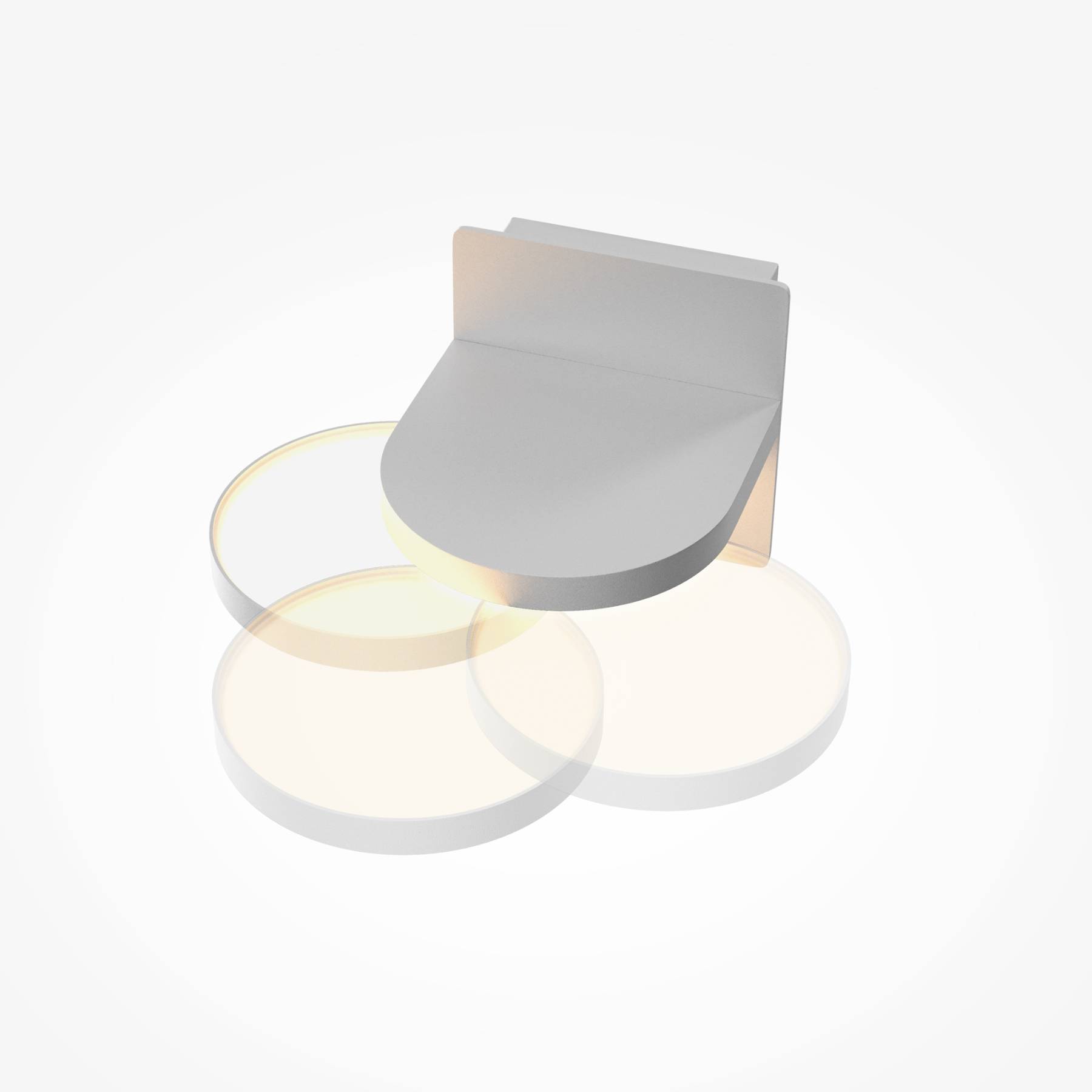 Арматура из металла выполнена в черном и белом цвете. Источник света — LED. Цветовая температура — 3000 К. Угол рассеивания — 120°. Уникальная деталь: включение и выключение осуществляется поворотом плафона в сторону. Источник света скрыт за рассеивателем из акрила. Это позволяет размещать светильники в гардеробной, прихожей, в прикроватной зоне.