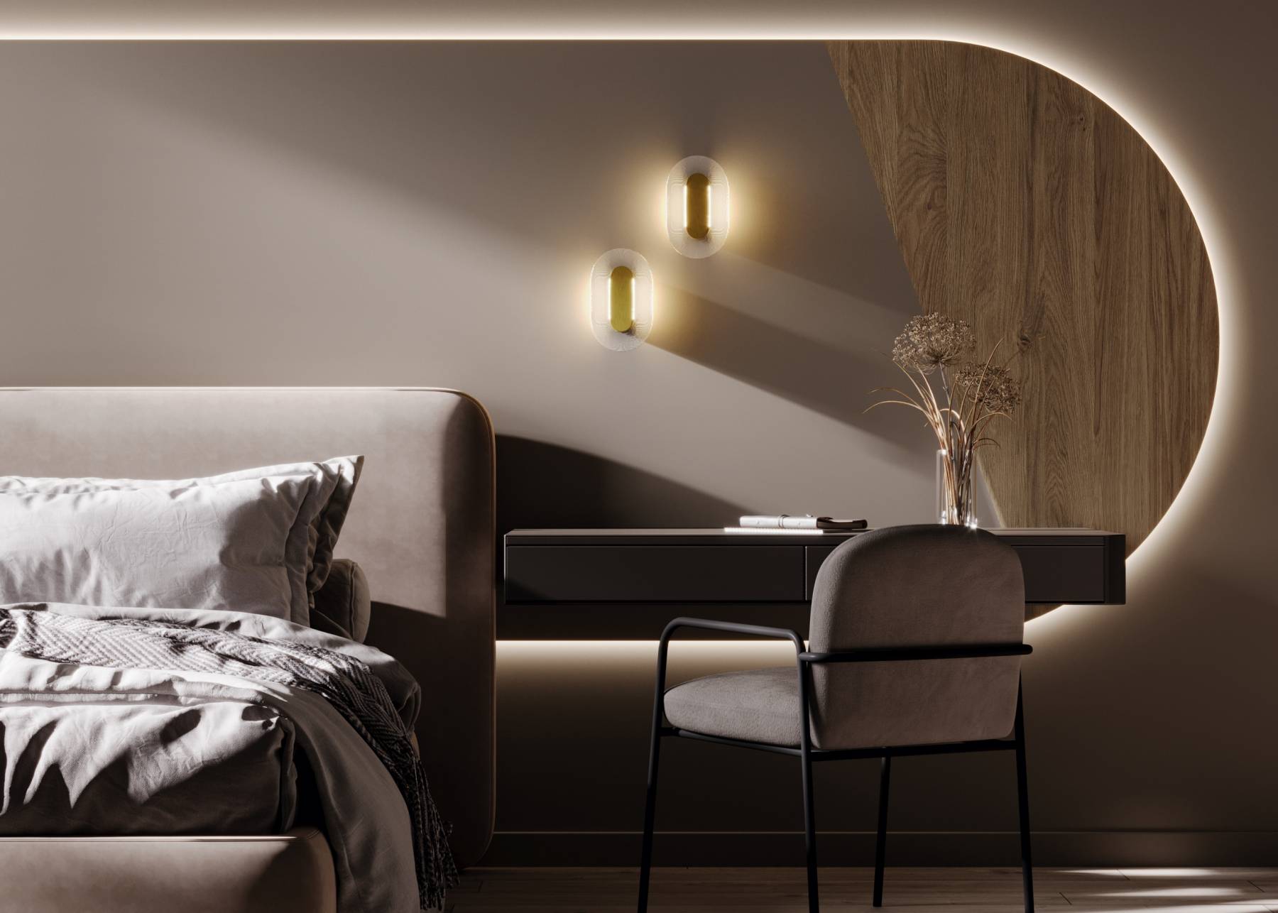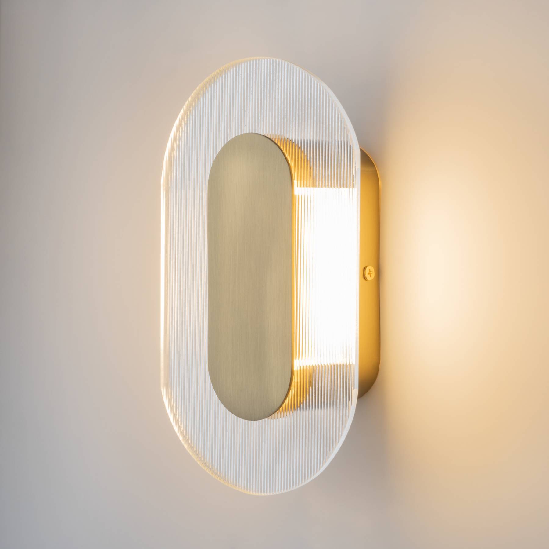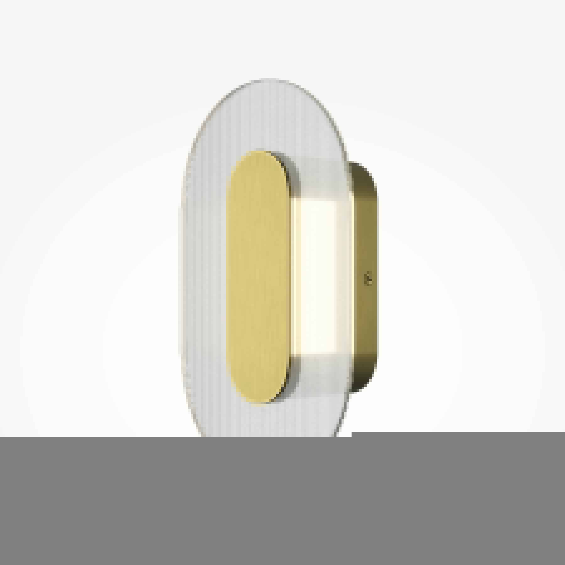 Компактная модель, выполненная из металлической арматуры цвета латунь с сатиновым эффектом. Плафон прозрачный. Источник света — LED.  Цветовая температура — 3000К. Угол рассеивания — 125°. Рассеянный свет.
