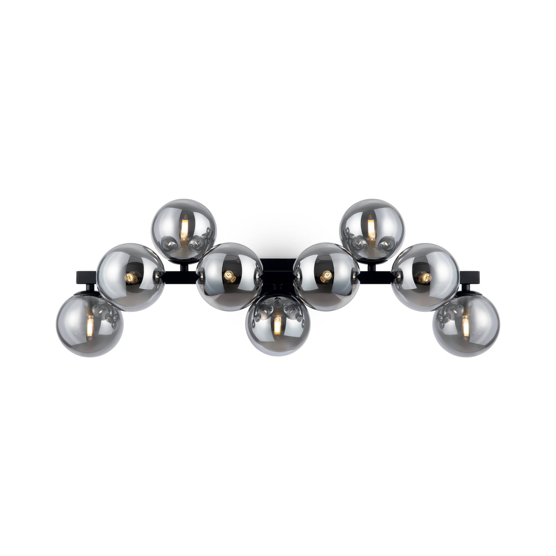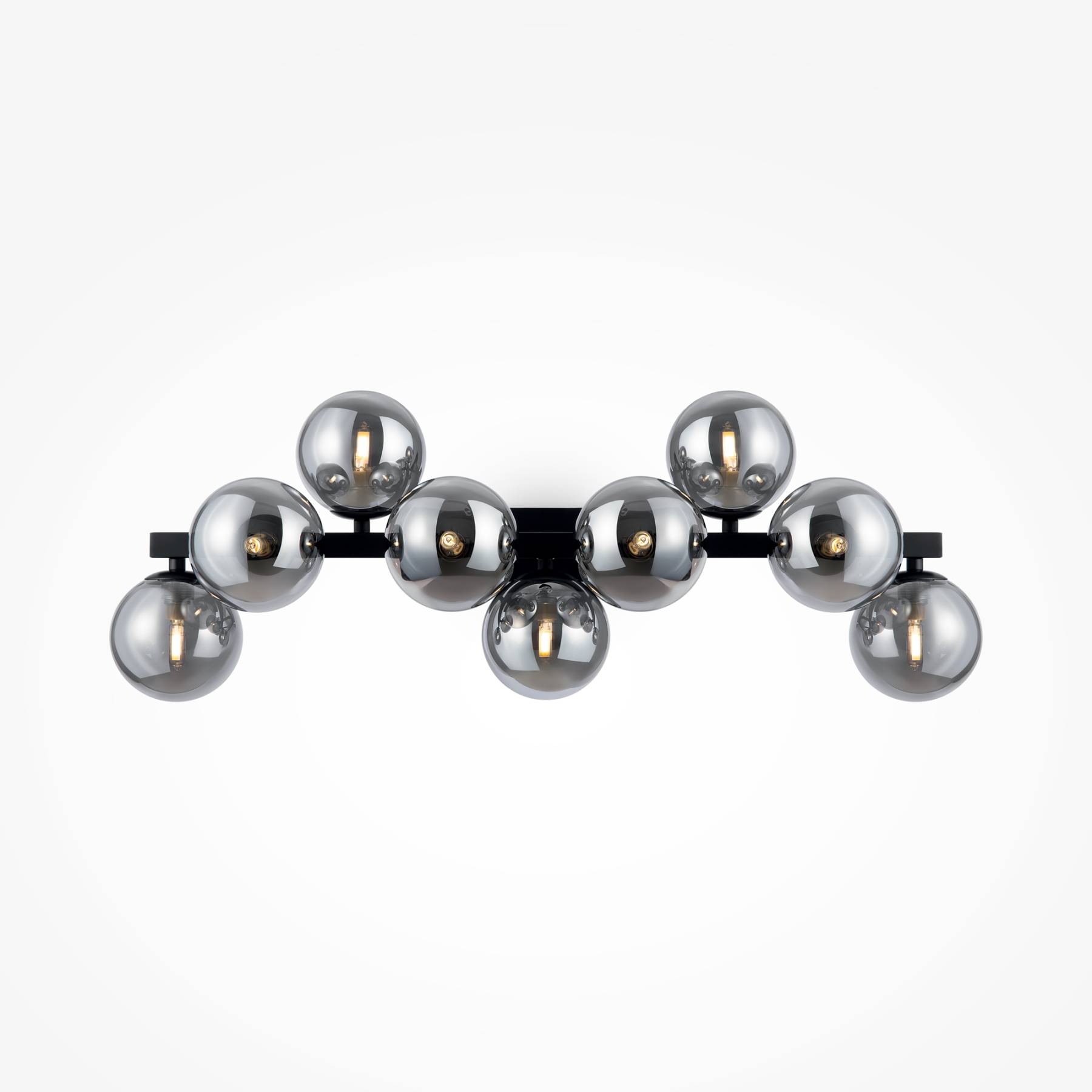 Металлическая арматура в четырех цветах: матовый черный, хром, золото, латунь. Плафоны — выдувное стекло. Цвета — дымчатый, янтарный, коньячный. Дизайн с имитацией молекулярной структуры. Высота подвесных светильников регулируется тросом. Лампа с цоколем G9.