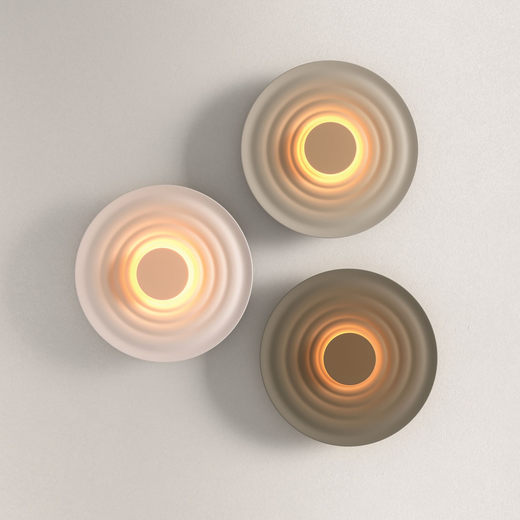 Светильники, вдохновленные японским садом камней и движением ветра. Волнообразные формы с матовой антибликовой поверхностью. Материал арматуры — алюминий. LED-источник света с температурой 3000К. Доступны в трех цветах: белый, серый, хаки. Переотраженный свет для создания мягкого освещения. Возможность составления различных композиций.