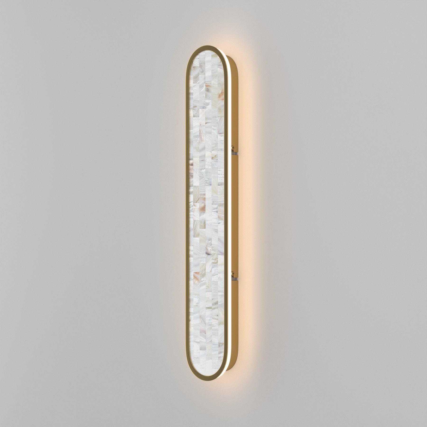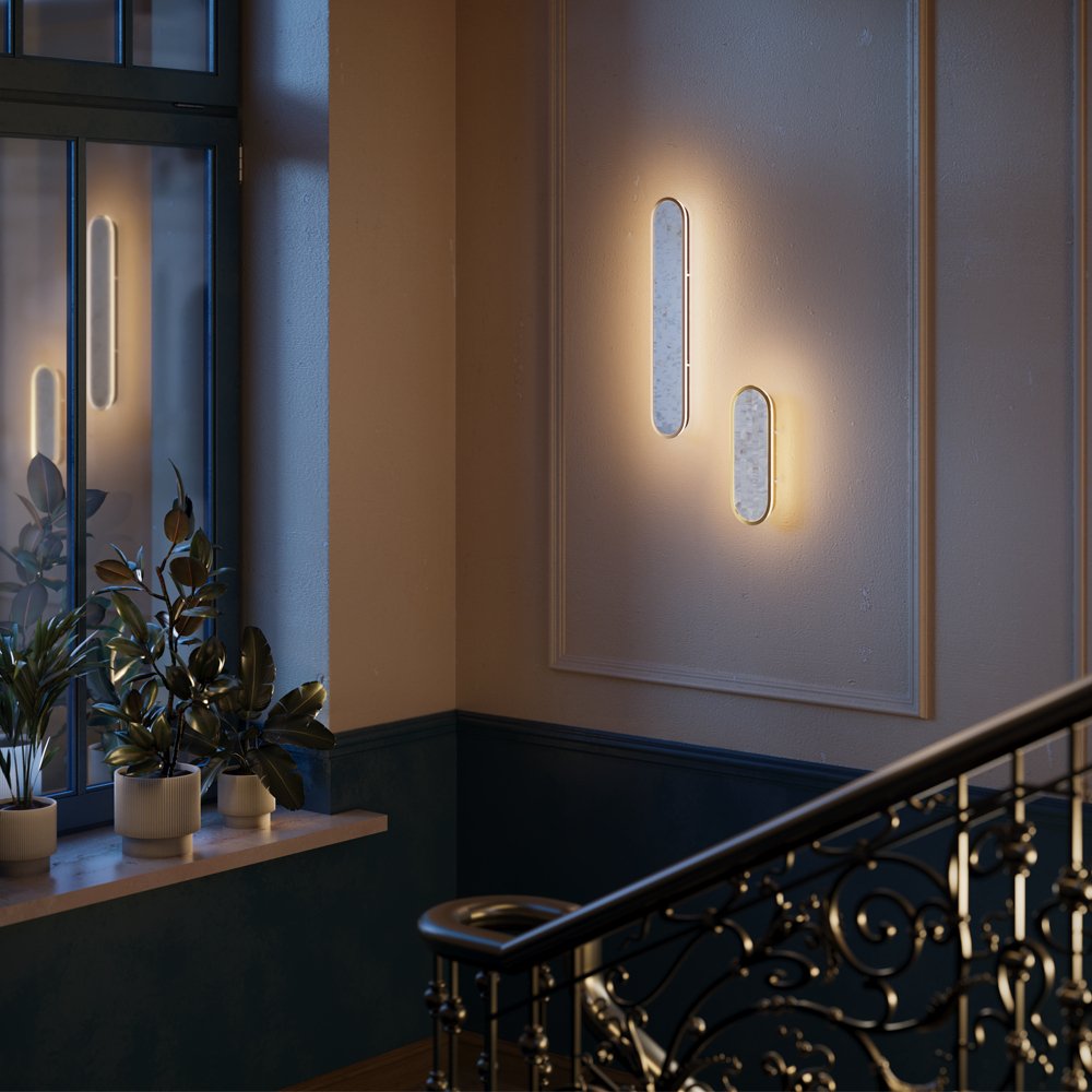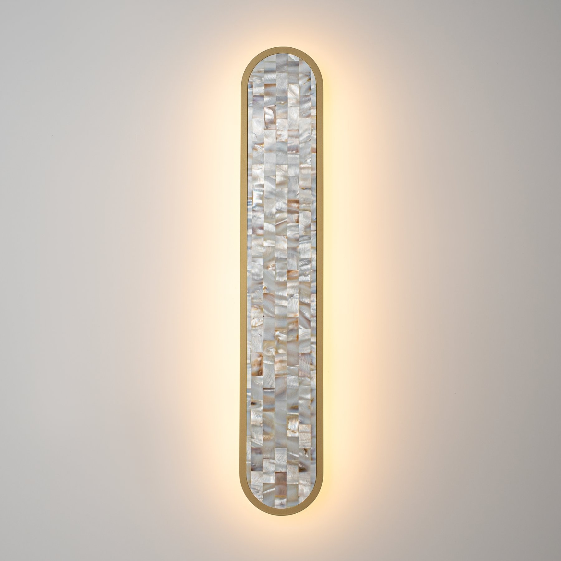 В серии представлены настенные светильники двух размеров и двух поколений. Декоративная мозаика из натурального перламутра играет нежнейшими бликами. Контраст текстур — переливы перламутра и матовая поверхность металла цвета латуни. LED-лента под акриловым рассеивателем создаёт ореол на стене. Предусмотрено трехступенчатое переключение температуры света через вкл-выкл (2700-3000-4000K), позволяющее создавать желаемую атмосферу. Эффектно светильники смотрятся и в комбинации друг с другом.