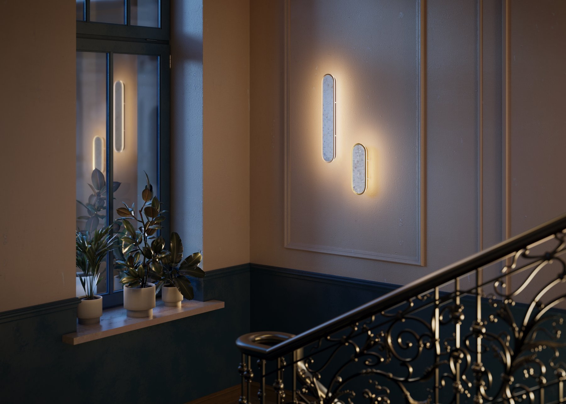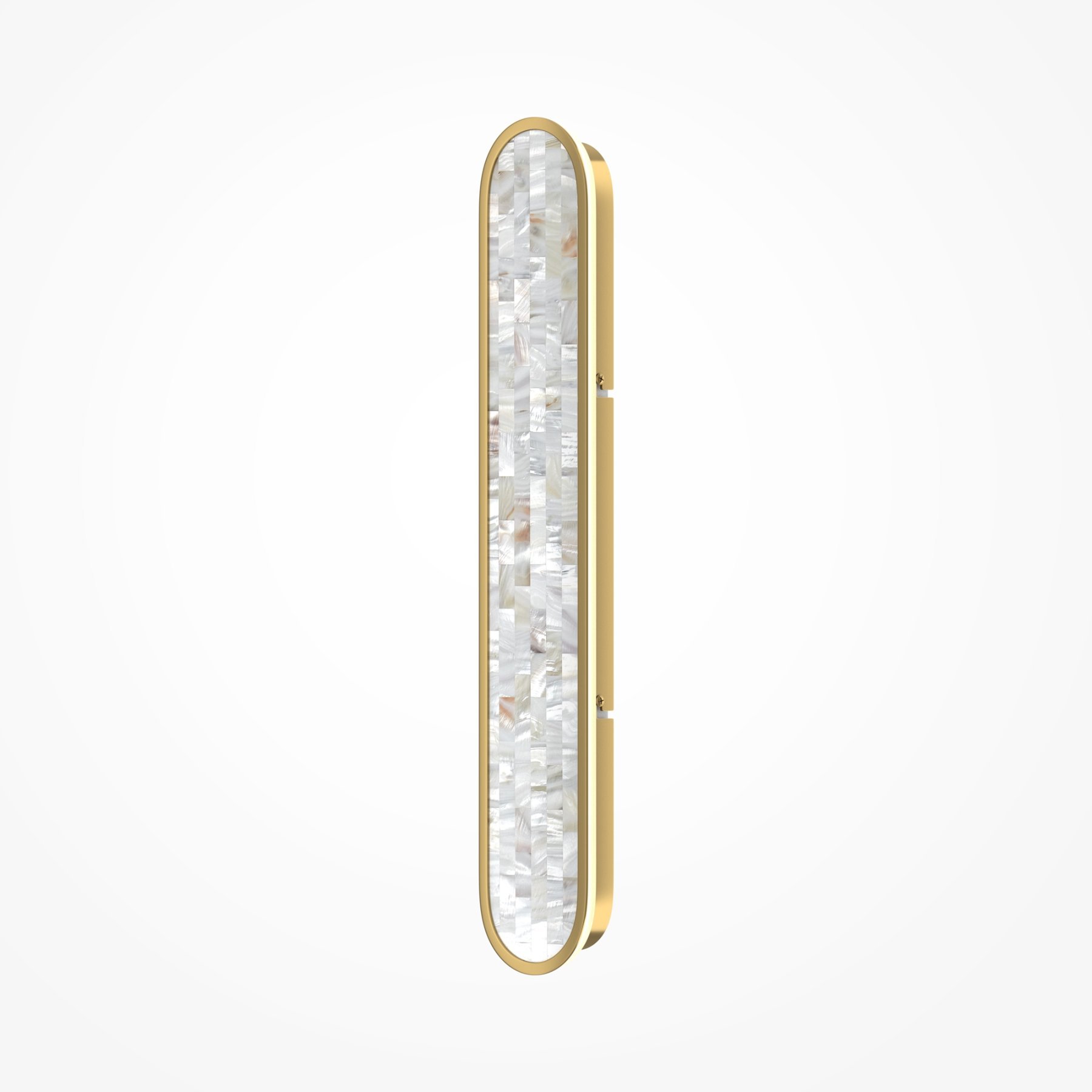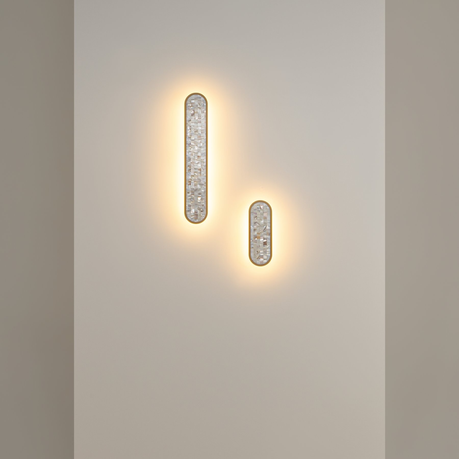 В серии представлены настенные светильники двух размеров и двух поколений. Декоративная мозаика из натурального перламутра играет нежнейшими бликами. Контраст текстур — переливы перламутра и матовая поверхность металла цвета латуни. LED-лента под акриловым рассеивателем создаёт ореол на стене. Предусмотрено трехступенчатое переключение температуры света через вкл-выкл (2700-3000-4000K), позволяющее создавать желаемую атмосферу. Эффектно светильники смотрятся и в комбинации друг с другом.