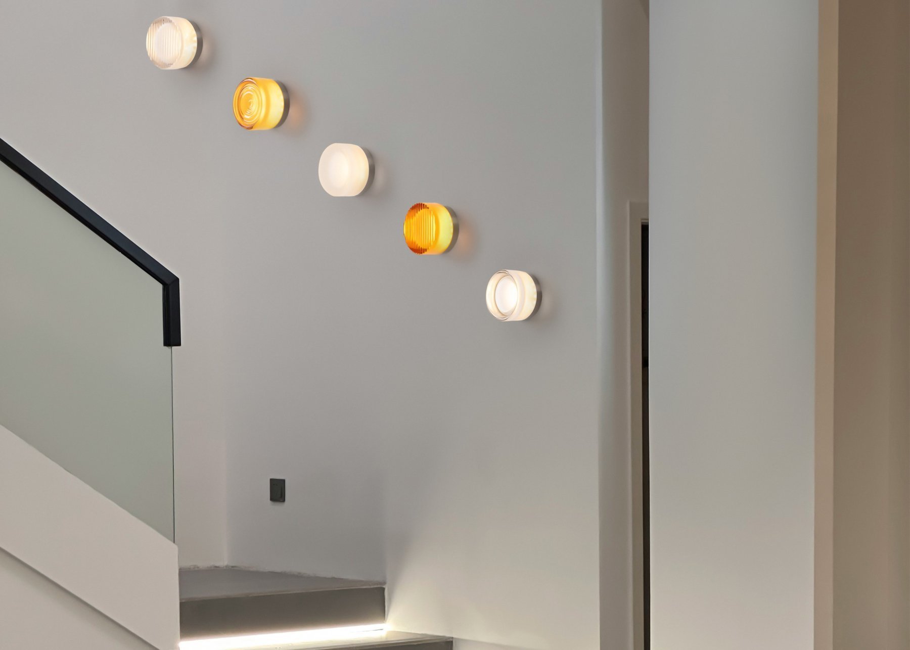 Металлическая арматура в цвете никель в трех  рельефных основаниях. Плафоны, выполненные в приглушенно пшеничном и янтарном оттенках, доступны в двух размерах. LED источник света 2400К/2550К/3000K.