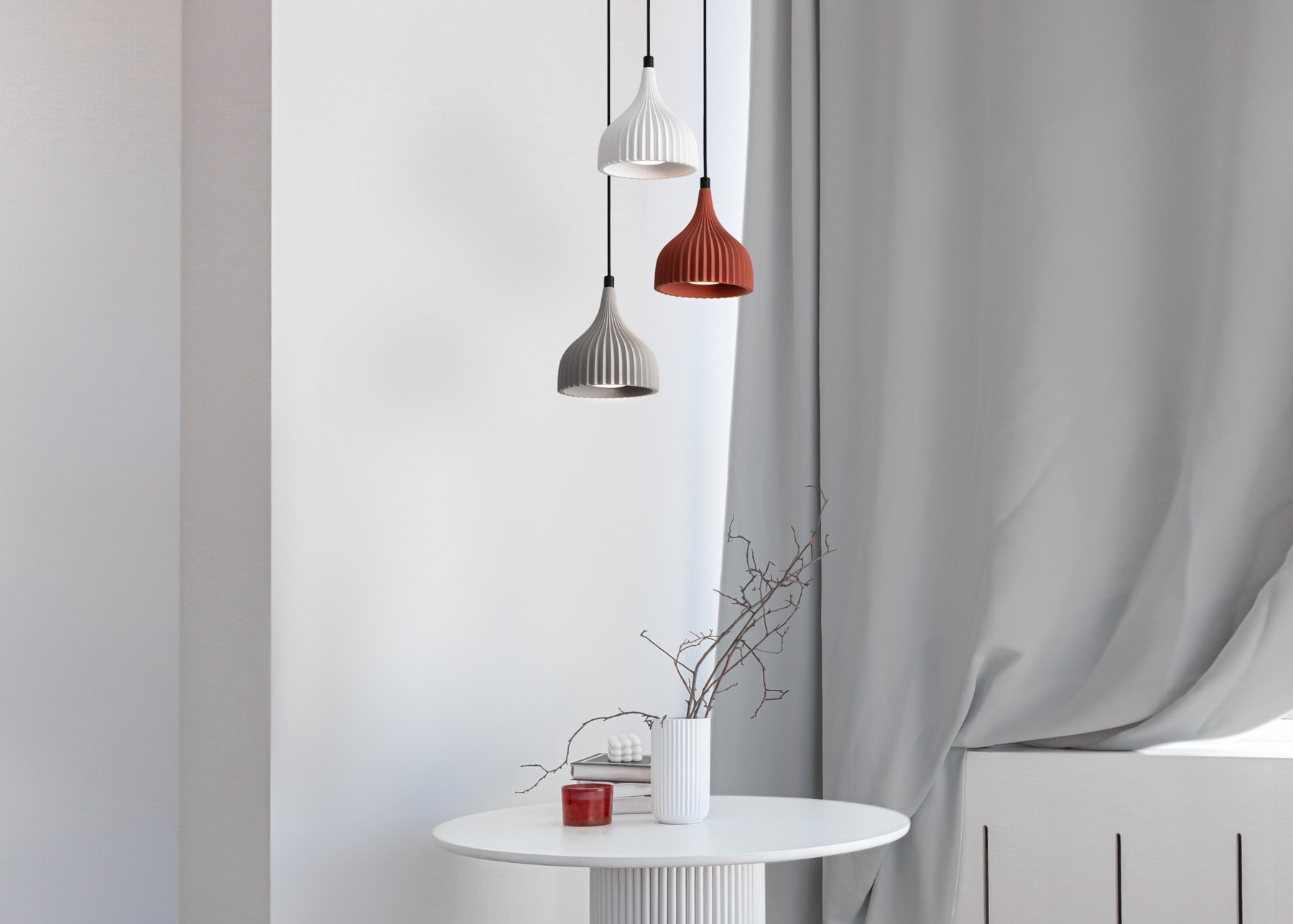 Арматура - металл. Абажуры из микроцемента: графит, красный, белый, серый. Лампы G9/GU10 (не в комплекте). Регулировка подвесов 210-2200 мм. LED 3000K. Яркий акцент в интерьере.