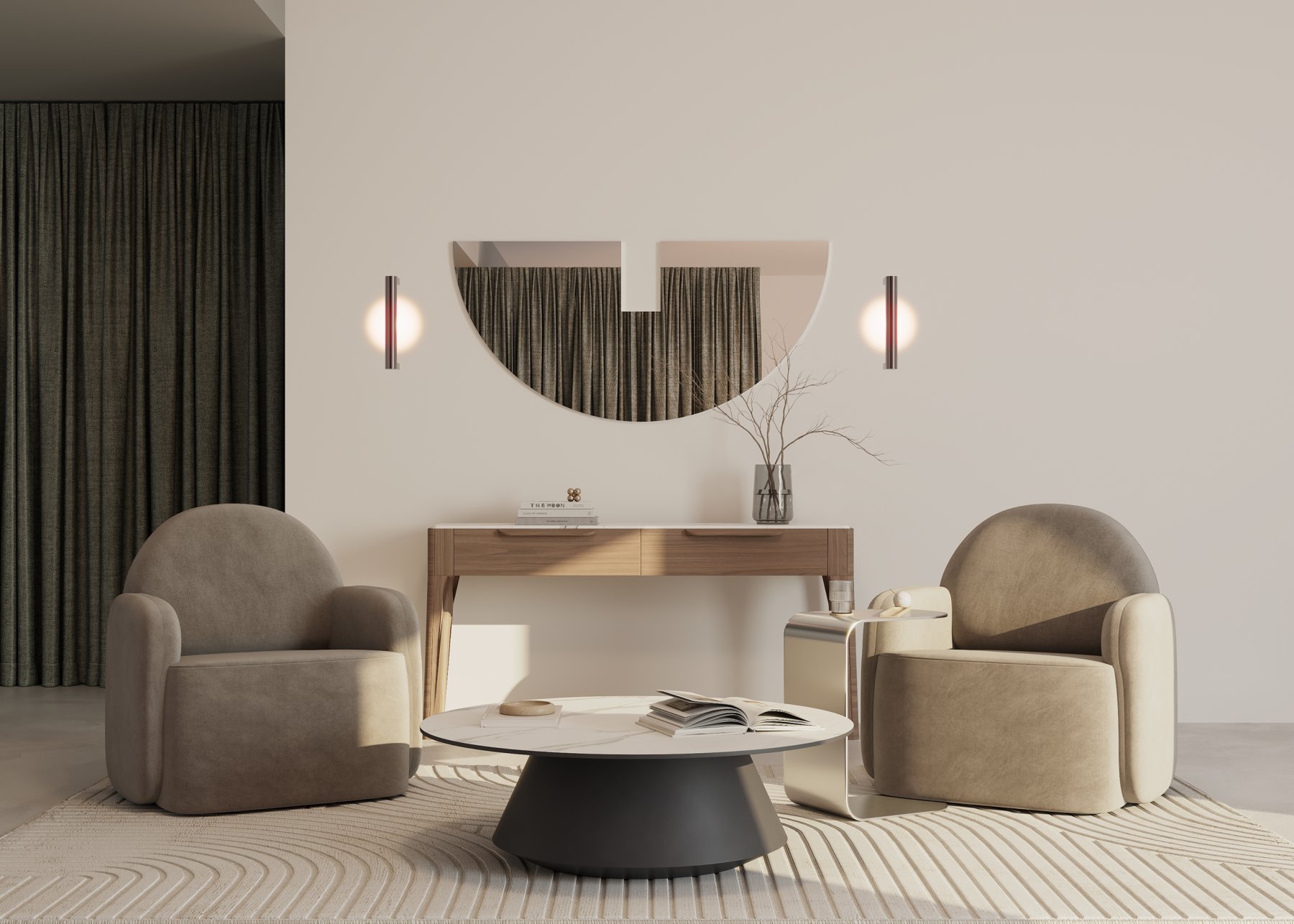 Металлическая арматура, цвета: черный, хром, золото. Источник света: LED-светодиод. Световая температура 3000К. Свет переотраженный, угол рассеивания 100 градусов. Дизайнерское решение с использованием линзы, создающей акцентный круг на стене и эффекта переотражения. Поверхность арматуры глянцевая, полузеркальная. Бра подойдет для зонирования помещений.