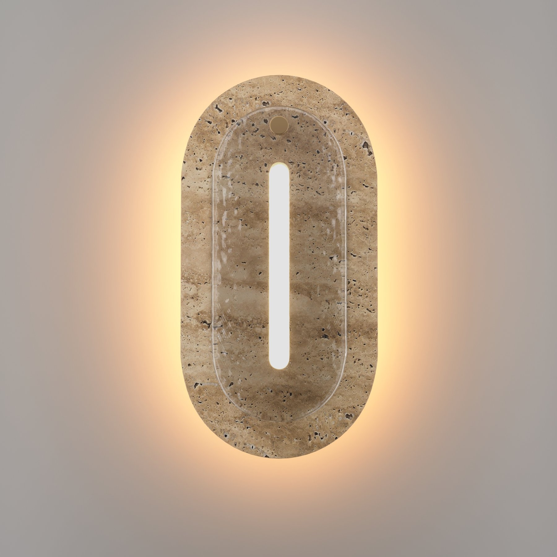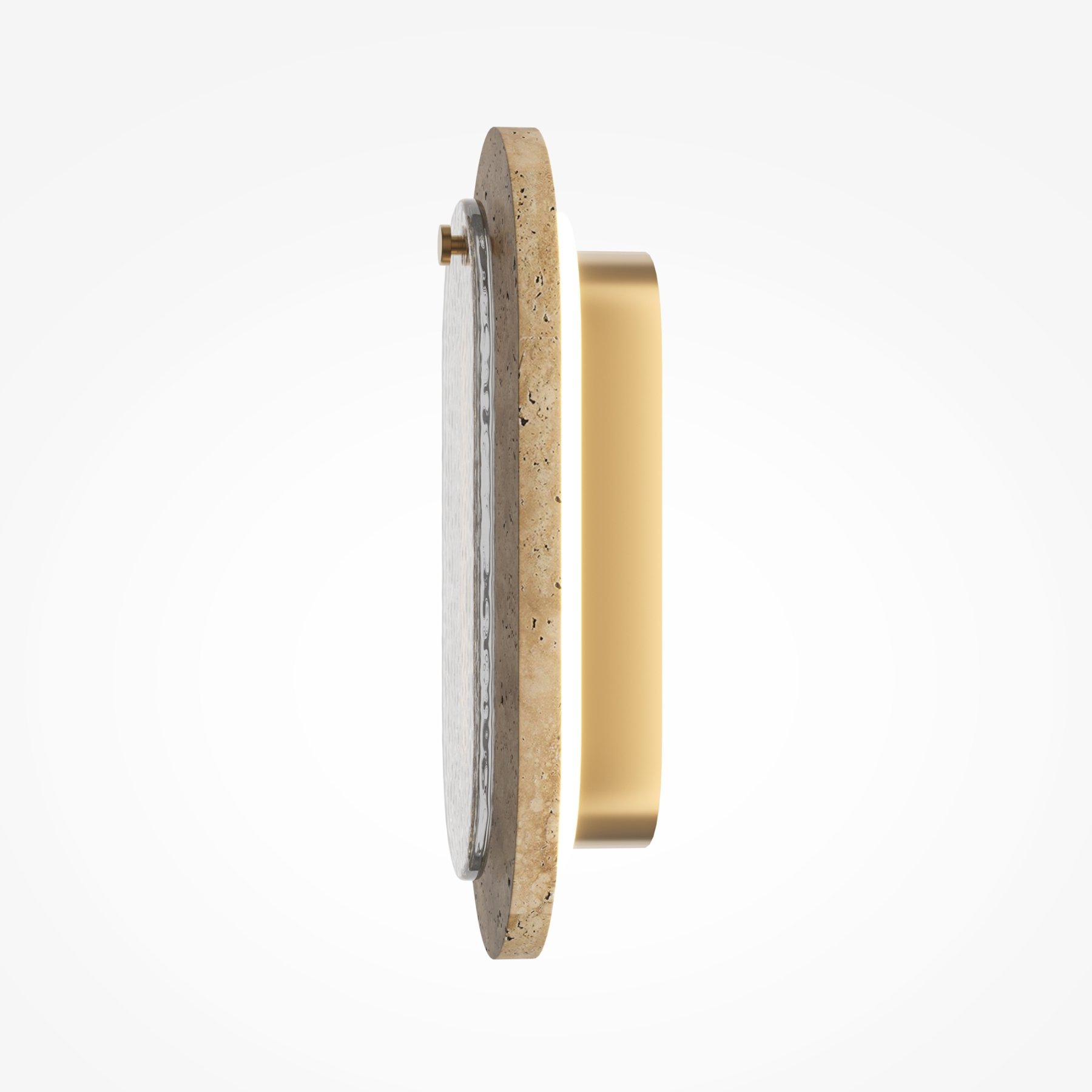 Характерный для серии контраст фактур: пористый травертин бежевого оттенка, металл цвета крашеной латуни и глянцевое стекло с «мятым» волнообразным паттерном. LED-источник (3000К) по контуру создаёт ореол на стене и подсвечивает стекло изнутри. Крафтовая обработка с неидеальными краями и лёгкой асимметрией придаёт каждому изделию эффект рукотворной эксклюзивности. Универсальны для современных жилых и коммерческих интерьеров. Эффектны как одиночный акцент и в композициях.