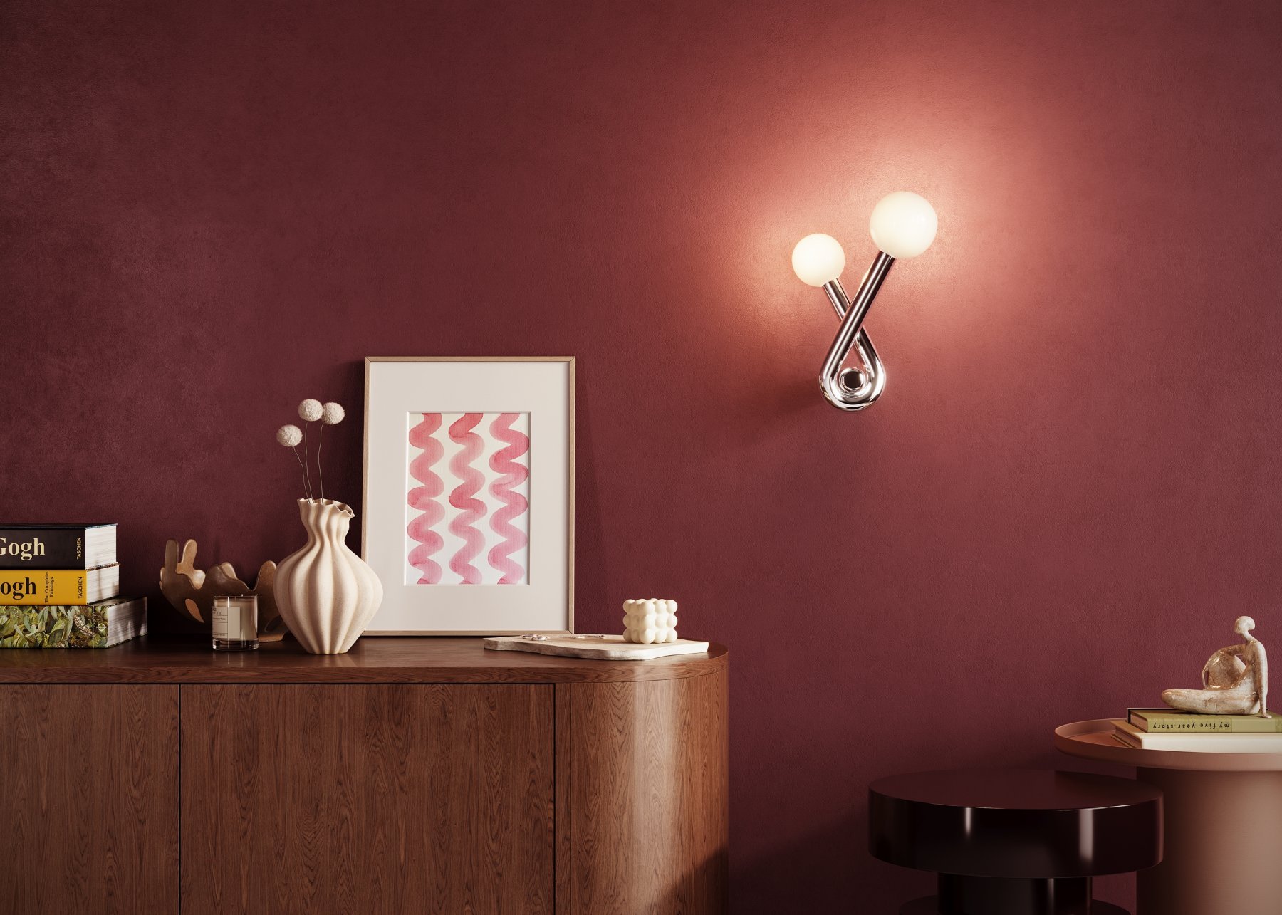 Серия отличается массивной металлической арматурой с органическими изгибами. Представлена в четырех цветовых вариантах: матовый черный, сатинированная латунь, глянцевые платина и молочно-бежевый. Плафон выполнен из глянцевого белого стекла, скрывающего сменный источник света с цоколем G9. Светильники создают выразительные акценты в интерьере, подходят как для одиночного размещения, так и для создания сложных инсталляций. Рекомендуется для пространств, где важную роль играет художественная составляющая.
