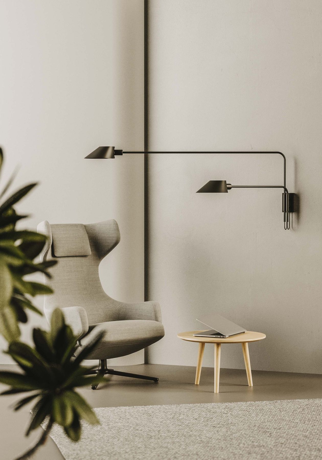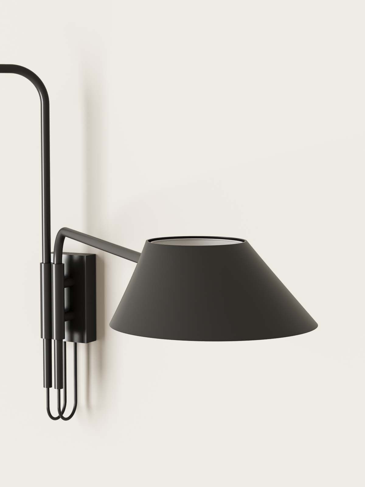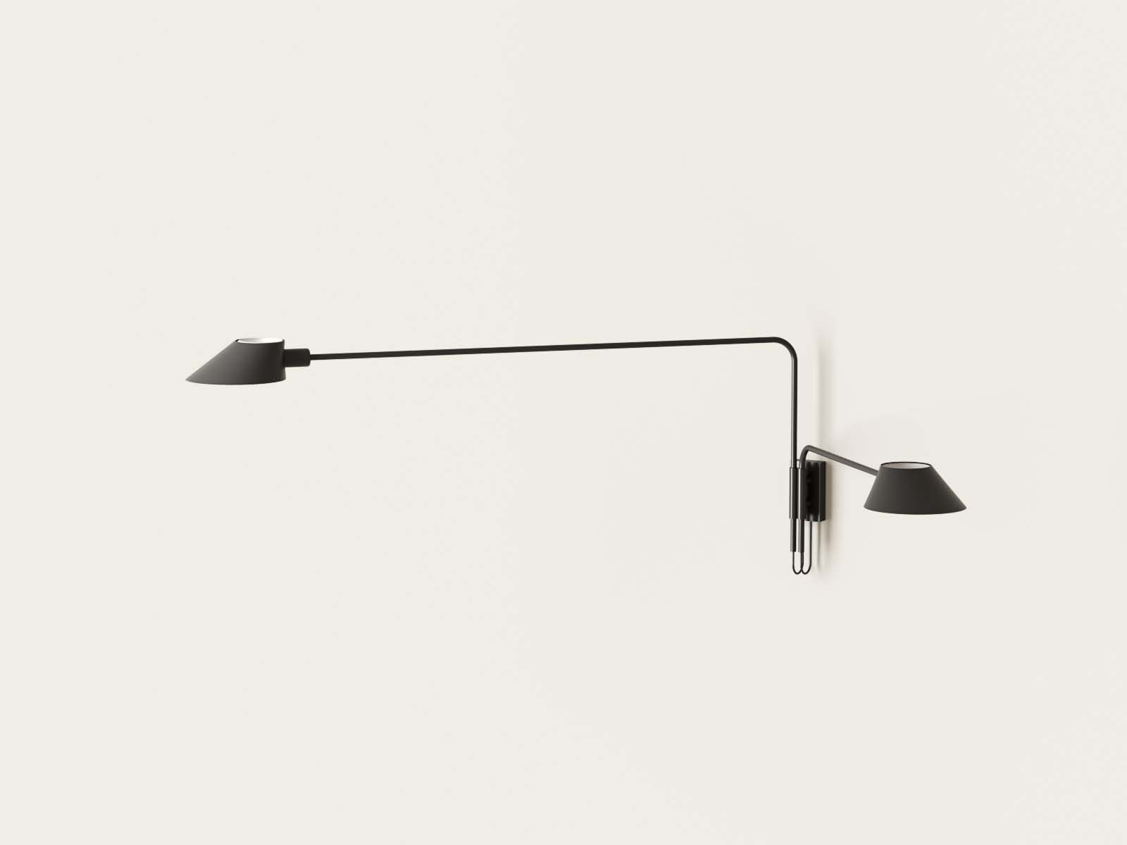 Поворотный светильник с двумя регулируеыми плафонами, выполненный из стали в матовой черной отделке снаружи и матовой белой - внутри плафонов.