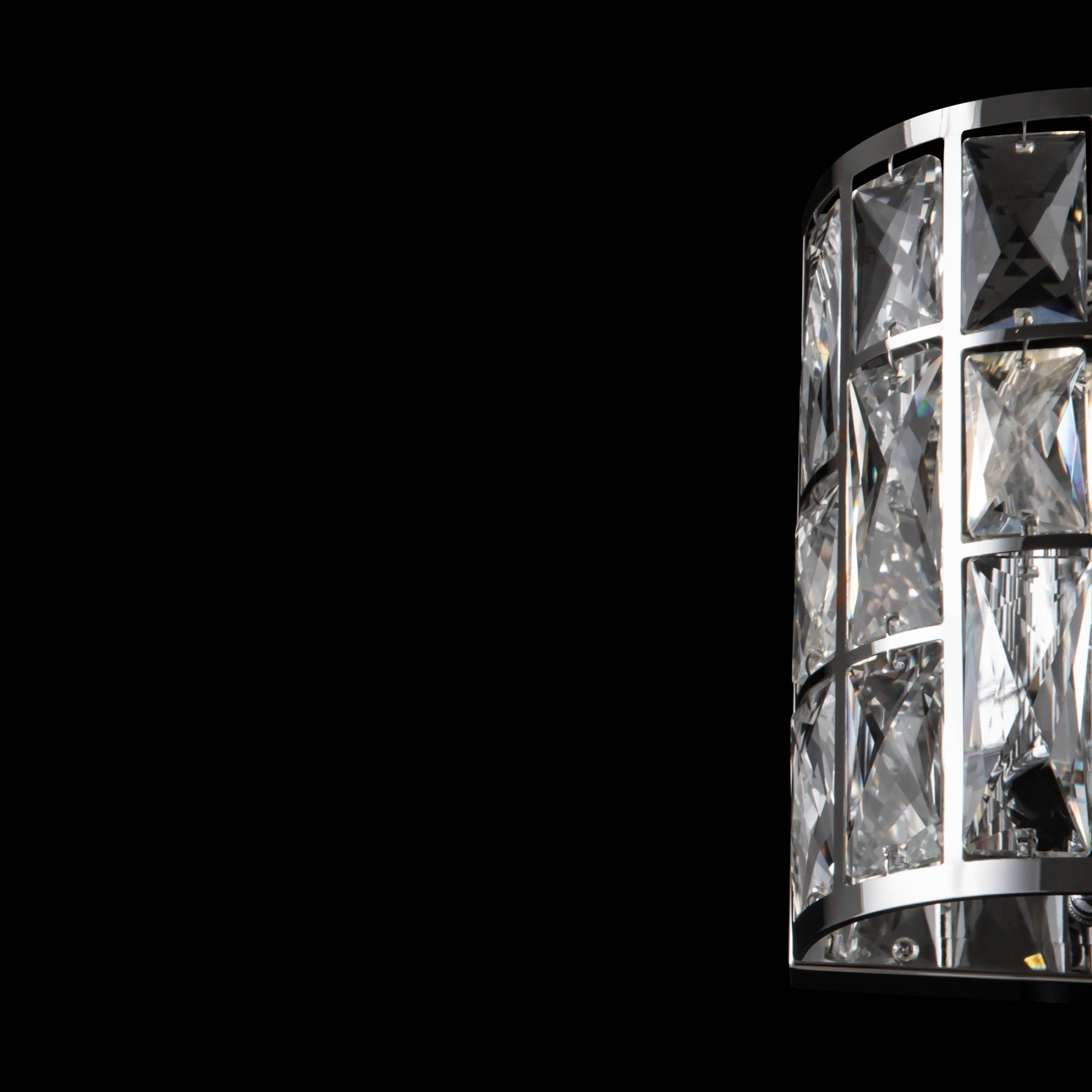 Металлическая арматура, цвет – хром. Каркас абажура – металл, декор – прозрач ный хрусталь. Потолочные модели с рассеивателем из матового стекла. Высота подвесных светильников регулируется.