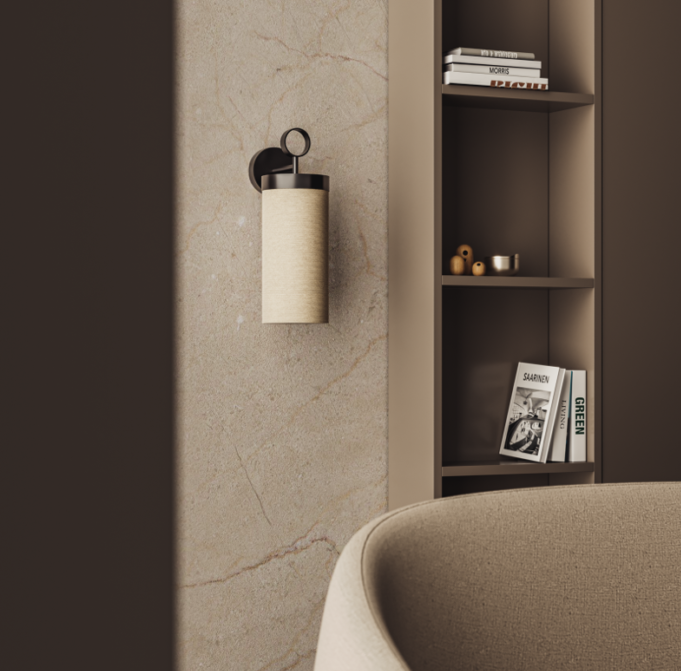 Настенный светильник, выполненный из металла в черной отделке и абажуром из натурального льна.
