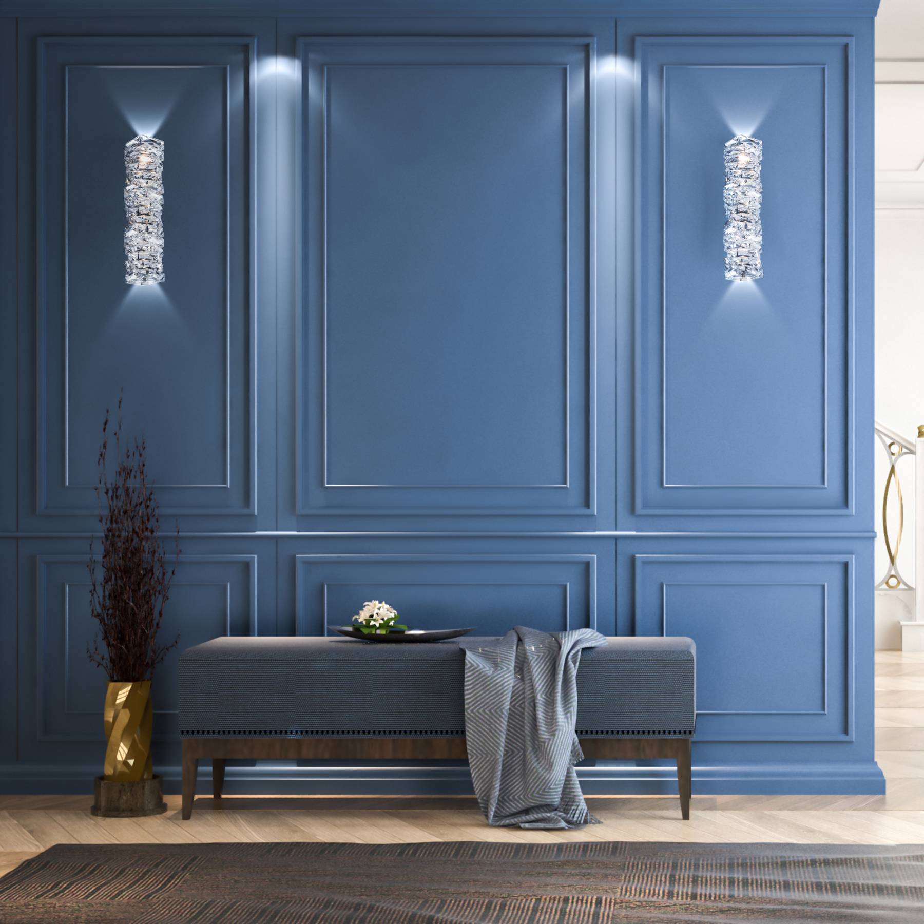 Арматура из нержавеющей стали и стекла, цвет арматуры – хром. Фактурный плафон с декором из стеклянного массива. Источник света – светодиоды с цветовой температурой 3000К.