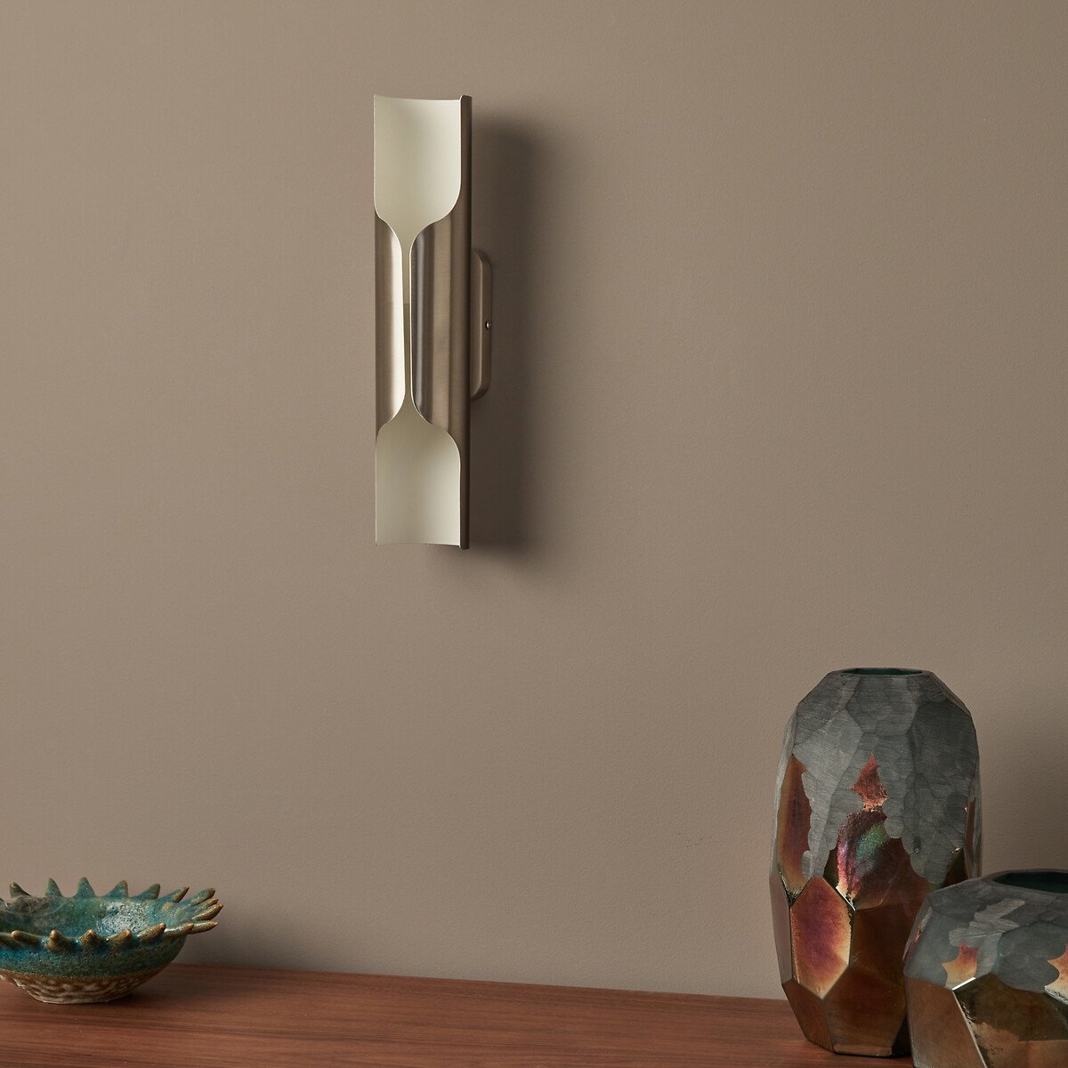 Светильник Henrio / Хенрио выглядит, как настоящий предмет искусства, к тому же еще и освещающий пространство. Настенный светильник излучает мягкий рассеянный свет, который отражается от основания благодаря внутренней золотистой отделке.Его трубчатая форма напоминает орган и вдохновлена эстетикой 70-х годов.Описание • Металл с вальцованной отделкой, покрытие — матовый никель • Металл, внутренняя отделка — белое эпоксидное покрытие • 2 цоколя G9 для ламп мощностью до 5 Вт (не входят в комплект)Размеры • Диаметр трубки: 7,5 см • Высота: 35 см • Глубина: 10 см • Планка для крепления: 7x12 смРазмеры и вес упаковкиОдна упаковка • Ш14 x В42 x Д16 см, 1,1 кг