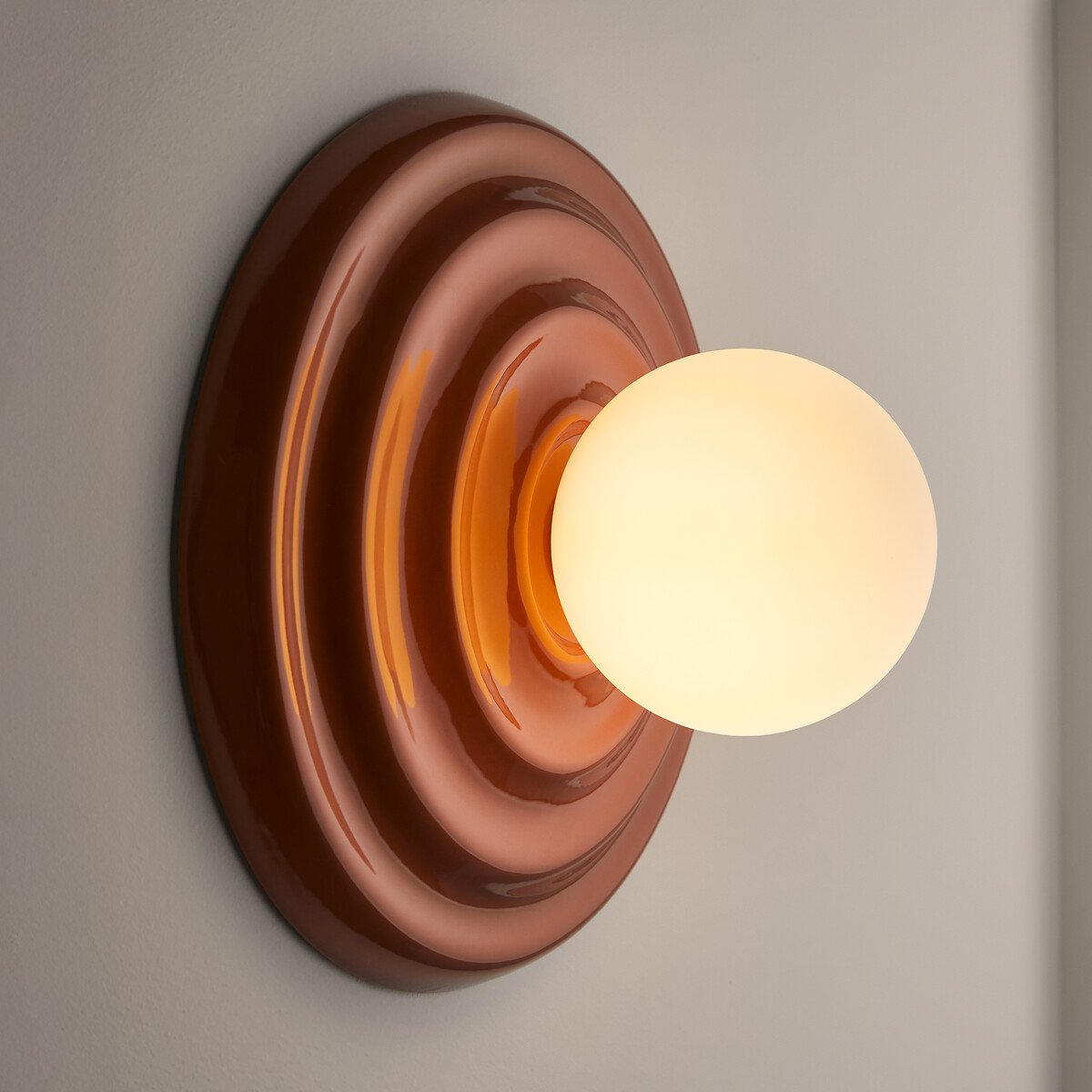 Мягкость матового опалового стекла в сочетании с оригинальным дизайном керамического основания — настенный светильник Holi привносит в современные интерьеры дух поп-музыки 70-х годов. Творение La Redoute Intérieurs.